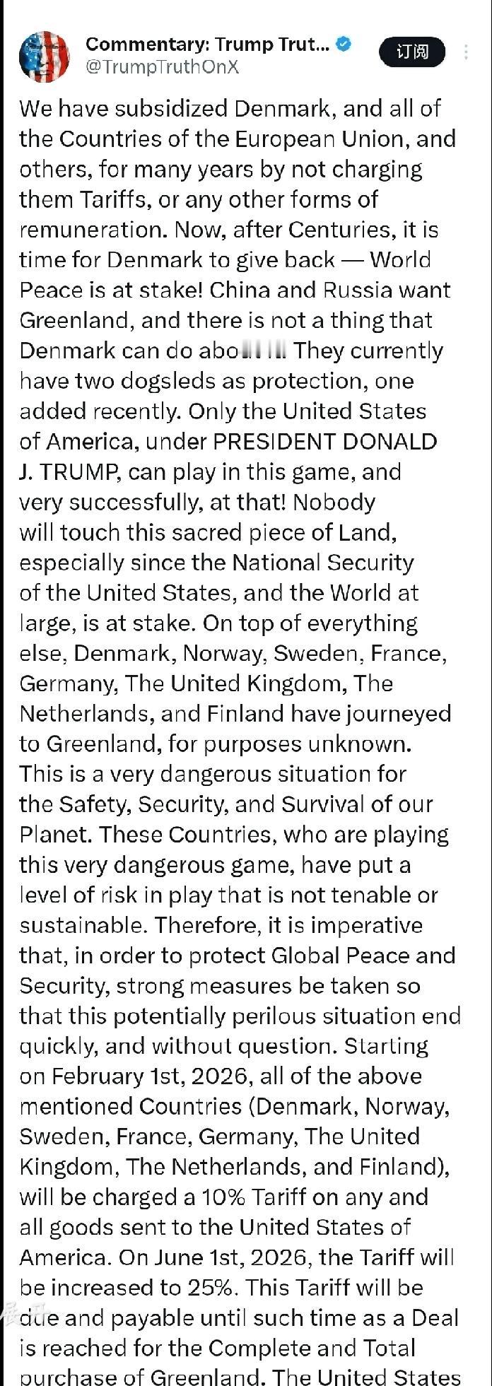 美国开始了 根据美国总统特朗普个人发文,央视新闻报道。个人认为:美国开始了对格陵兰岛的侵略,欧洲各国反对但是否有效?有待观察。 这表示:美国正在实行— 唯我独尊,全球各国资源任我索取,反抗就打 —新方法。 美国人不要忘记,欧洲也是强盗的后代。