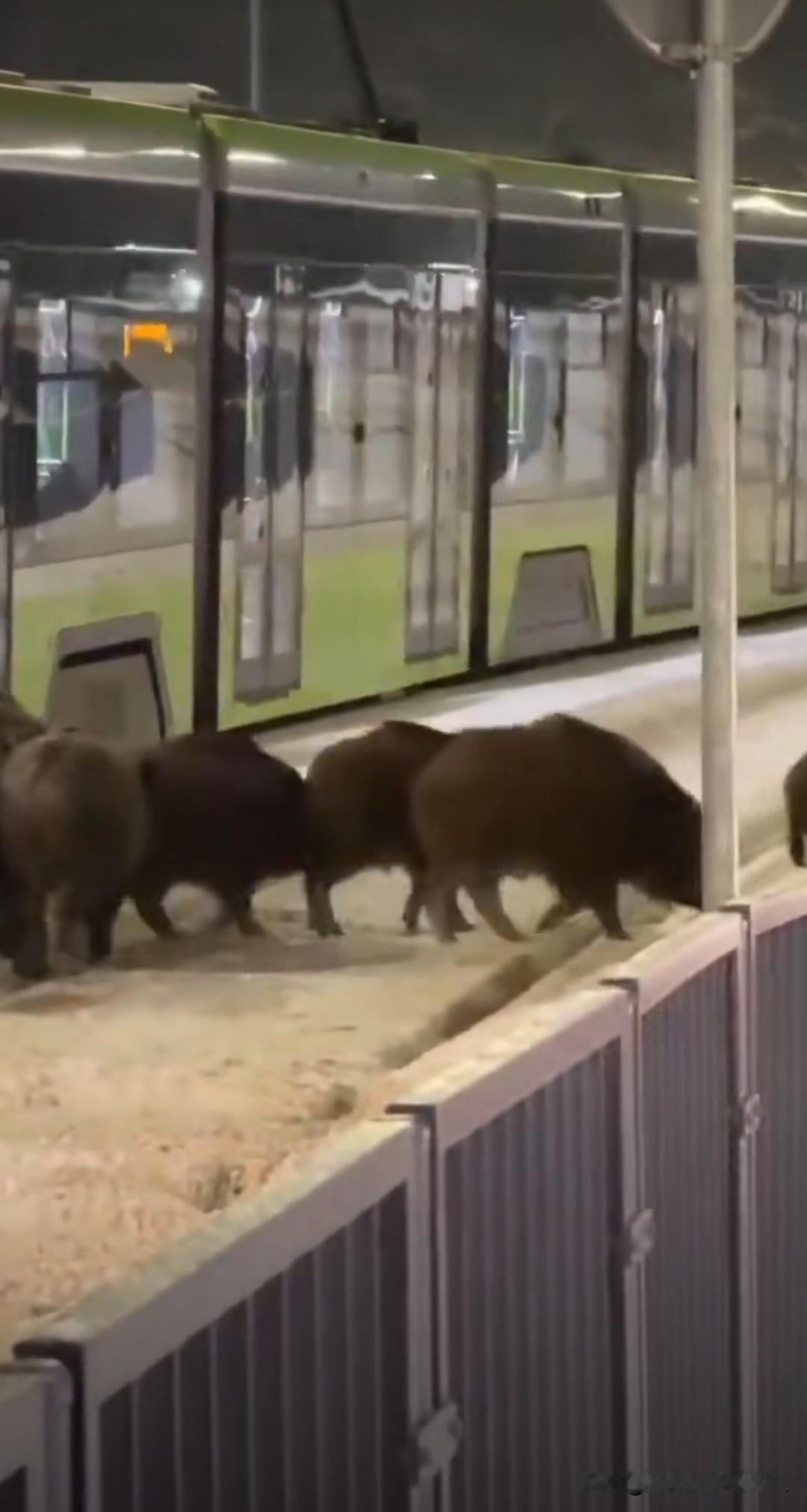 在波兰奥尔什丁市,一群野猪挡住了有轨电车的去路。 大约十头野猪长时间阻碍有轨电