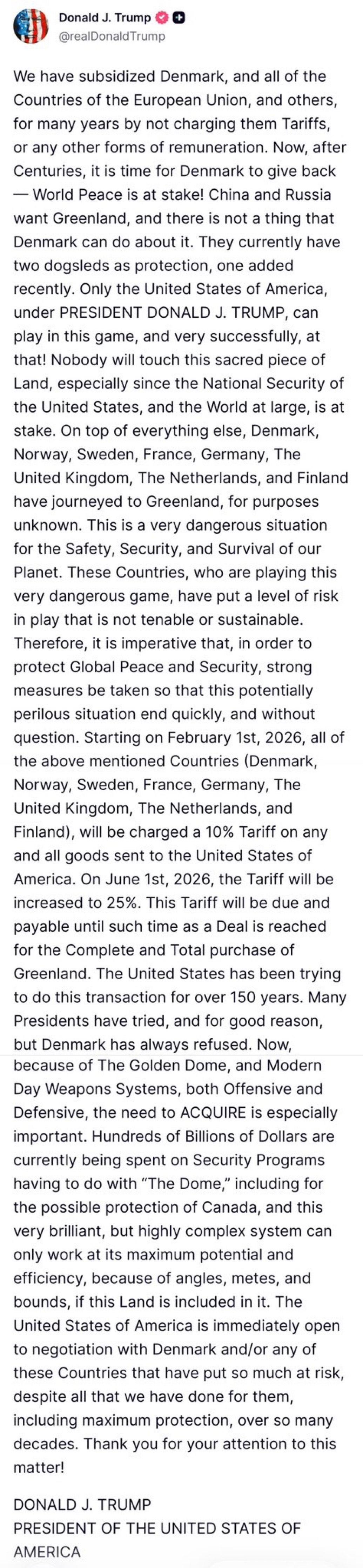 特朗普周六表示,在白宫推动吞并格陵兰岛的过程中,向格陵兰岛派遣少量部队的八个北约国家,从2月1日起,所有运往美国的商品将被增加征收10%的关税。