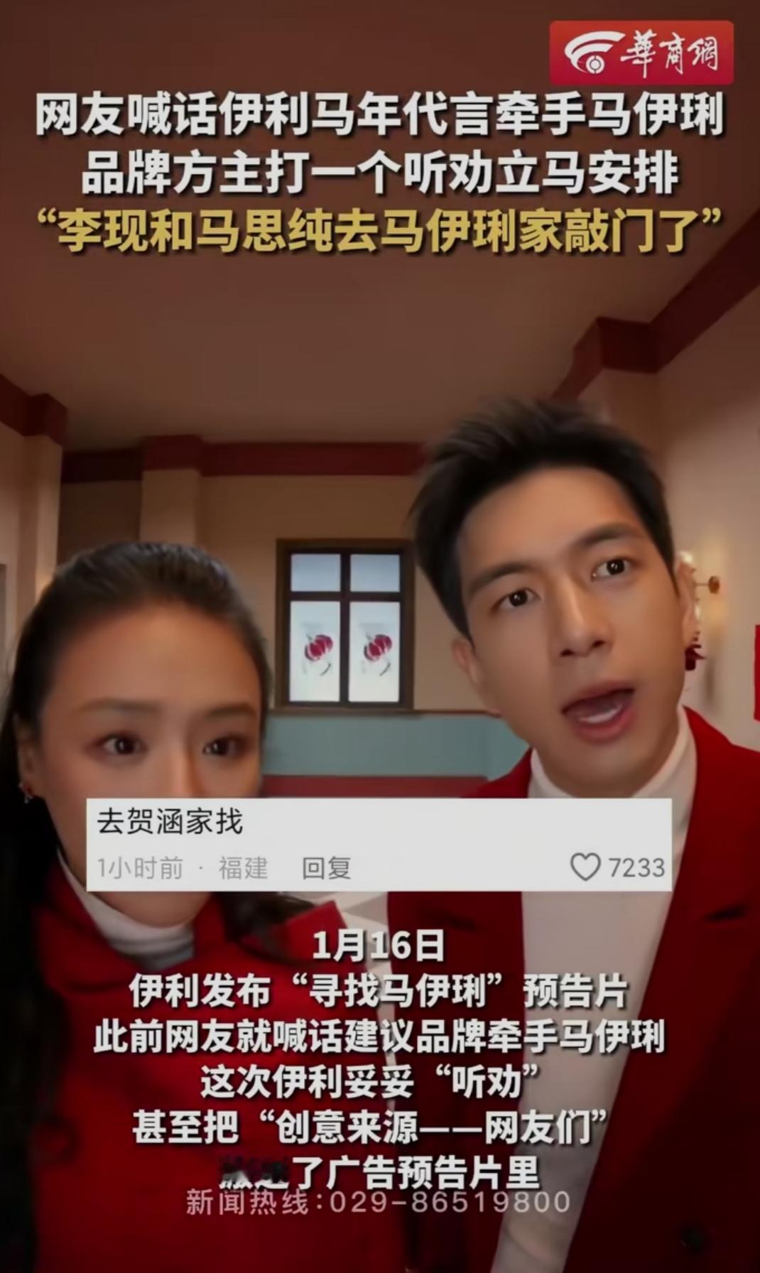 现在的网友果然是隐藏的营销鬼才!随口提的联动建议居然能被品牌当真,这种被重视的感觉也太戳人了,原来普通人的脑洞也能掀起这么大波澜。 网友脑洞大开喊话伊利,马年就该找马伊琍代言,本是一句玩梗式提议,没成想品牌方主打一个“听劝”,立马安排李现、马思纯直奔马伊琍家促成联动,网友纷纷直呼“这波操作太会了”。 从网友随口调侃到品牌快速落地,这场双向奔赴的联动太圈好感。有人觉得是精准拿捏流量,也有人夸品牌懂用户、不端着。你觉得这种“听劝式营销”够新颖吗?还想看哪个品牌跟风玩梗?来评论区聊聊~