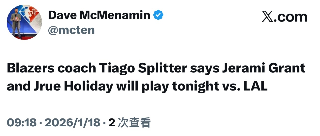 开拓者主教练斯普利特说,格兰特和霍勒迪今天都会上场。