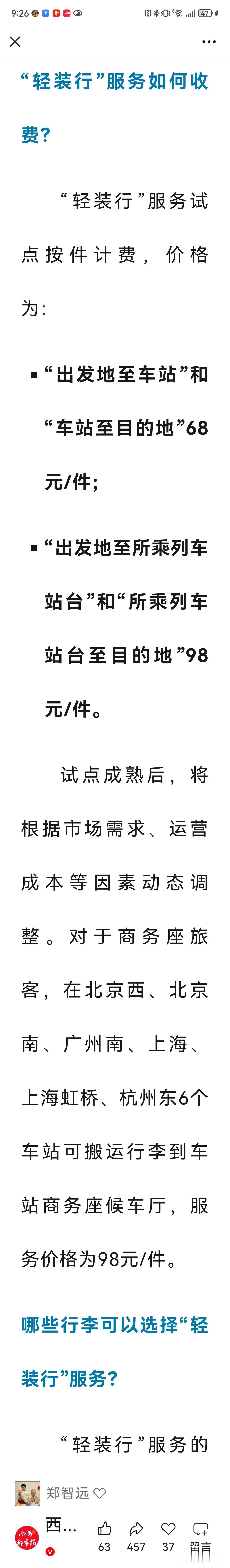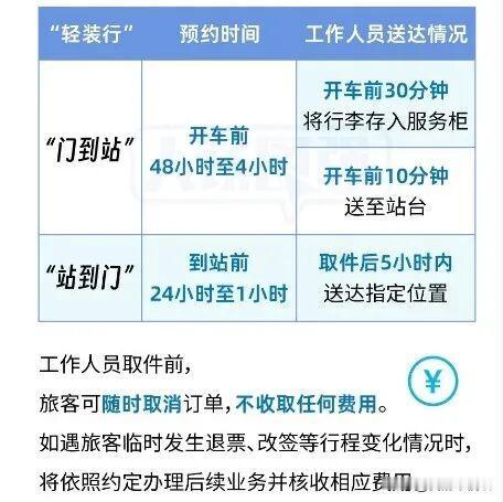 西宁火车站开通一项新服务!高铁出行不用扛行李了!铁路“轻装行”服务已覆盖全国超百个车站,西宁、拉萨等地也开通啦! 这服务就像“行李跑腿”:出发前可预约工作人员上门取行李,直接送到车站站台或寄存柜;到站后也能预约将行李送到家。收费明码标价:同城“门到站”或“站到门”每件68元;若要求直接送到站台或从站台取,每件98元。 算笔账:如果只是一个行李箱,打车可能更便宜。但这服务更适合行李多、重量大、或独自带娃出行的旅客——省力也省心,全凭自愿选择。 要注意的是,行李须符合铁路规定:普通旅客每件不超过20公斤,动车行李长宽高之和不超过130厘米。目前试点期间按件收费,未提及超重附加费,但未来是否像飞机那样细化收费,还需观察。 总的来说,这是铁路服务精细化的一步,让出行多了一个省力选择。你会试试吗?