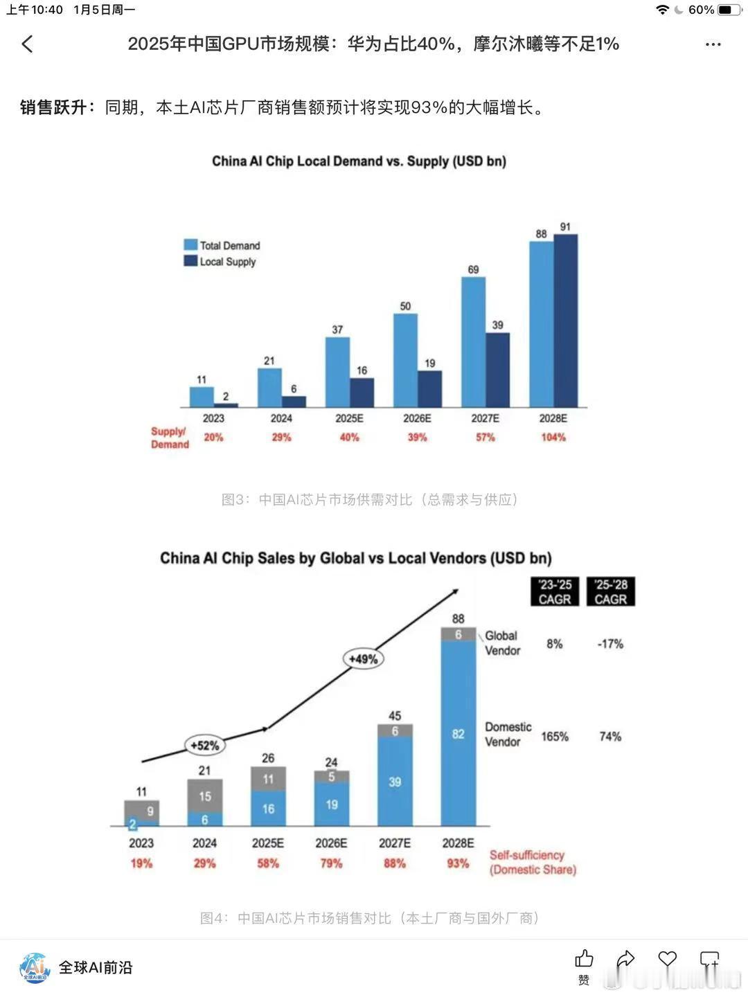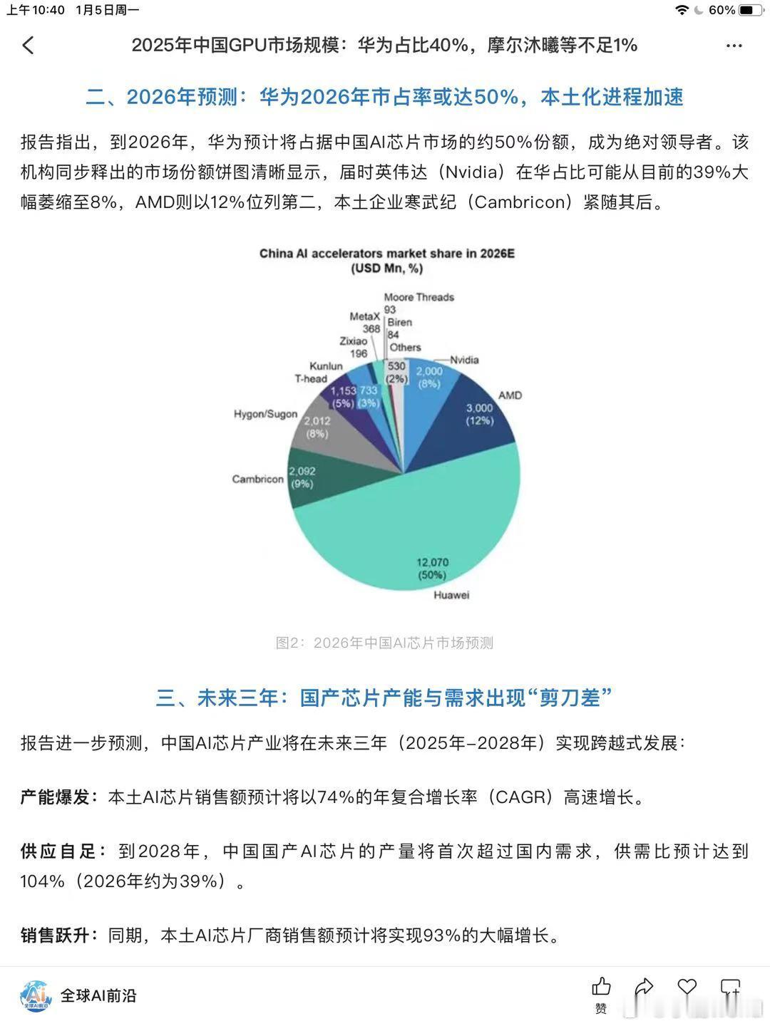 以下基于Bernstein Research《China AI Accelerators Market Share》报告,对2025-2028年中国AI芯片(含GPU)市场格局与供需趋势的精准梳理+关键修正,方便快速对照:一、2025年现状(核心结论)• 整体规模:约255亿美元;华为与英伟达各占40%(华为约102.68亿美元,英伟达约101.98亿美元),形成双雄格局。• 其他玩家:海光、寒武纪各约4%;AMD、阿里平头哥、百度昆仑芯等多为2%-3%;摩尔线程、壁仞科技等合计约1.3%。二、2026年预测(核心结论)• 华为:份额至50%,成为绝对龙头。• AMD:份额至12%,跃居第二。• 英伟达:份额骤降至8%(受出口管制、特供版性能受限影响)。• 寒武纪:份额约9%,位列第三;海光约8%;其他本土厂商合计约21%。三、2028年供需预测(核心结论)• 本土AI芯片供需比104%(供给910亿美元,需求880亿美元),首次供大于求。• 2026-2028年本土AI芯片销售额复合年增长率74%,三年增长约93%。• 关键转折:2026年起本土厂商加速承接替代需求,2028年完成从外部主导到自主主导的切换。