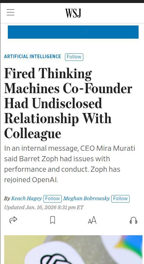 《华尔街日报》报道,前几天被Thinking Machines Lab开掉的Barret Zoph(又光速入职OpenAI), 开除原因是办公室恋情。。原来这出八卦狗血剧是真的八卦啊?