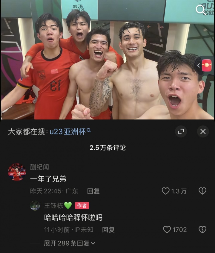 直播吧01月18日讯U23国足闯入U23亚洲杯半决赛,王钰栋社媒晒出更衣室庆祝视频,蒯纪闻评论“一年了兄弟”,王钰栋回复“哈哈哈哈释怀啦吗”。