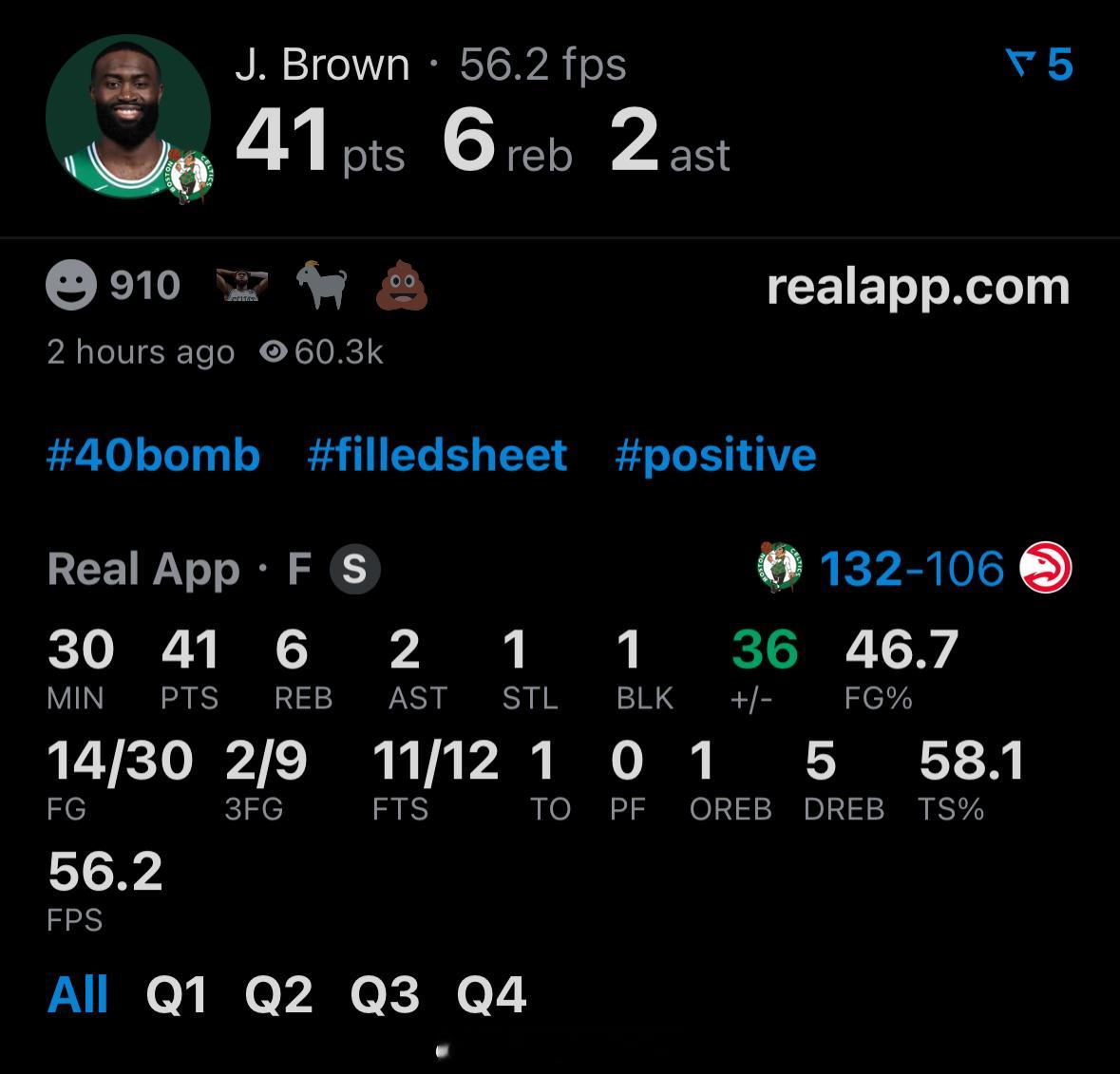 布朗状态回暖,略微发力,三节打卡41分6篮板,正负值+36波士顿凯尔特人凯尔特人