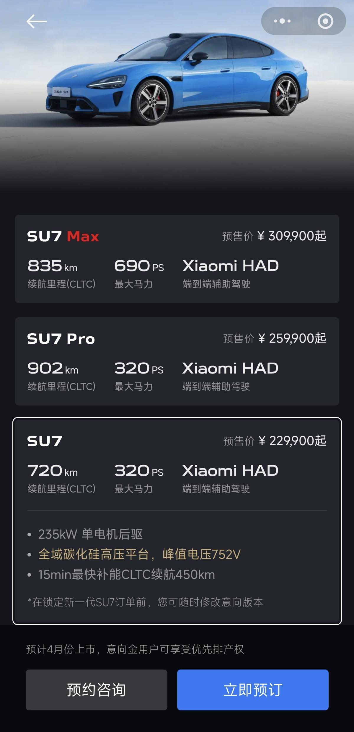 本来想看一下小米SU7现在的交付周期,发现目前只有新款的预订界面了,4月份之前只