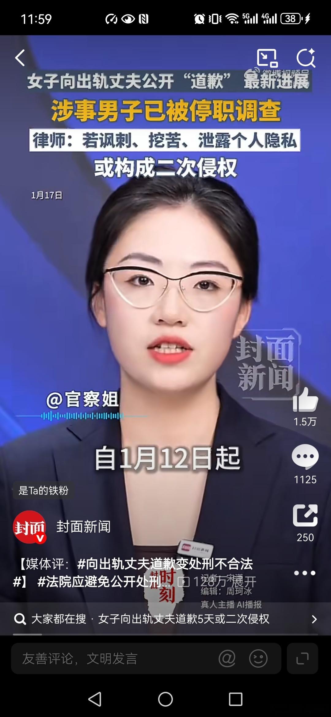 法院应避免公开处刑闹剧重演向出轨丈夫道歉女子直播被封向出轨丈夫道歉女子称自己多次住院向出轨丈夫道歉女子或二次侵权网络不是法外之地,这女子把违法侵权当时尚,毕竟曾经相爱过,不合则分,何苦彼此伤害。 从人情看这个判决判的好!原告胜诉,被告也乐于执行从法理看,这就是个人隐私和公开赔礼道歉的矛盾问题。一个两败俱伤,谁都捞不着好处的结局。 丈夫确实不应该出轨,但是也不能让其接受全网审判,被网暴,他也有自己的名誉权和隐私权,这个女的就是鱼死网破,为了流量,这种做法真的不值得推广,