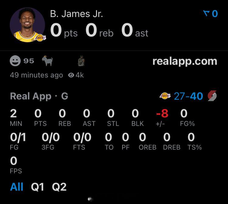 首节战罢,父子合砍2分詹姆斯7中1,得2分,正负值-10布朗尼1中0,得0分,正负值-8湖人vs开拓者