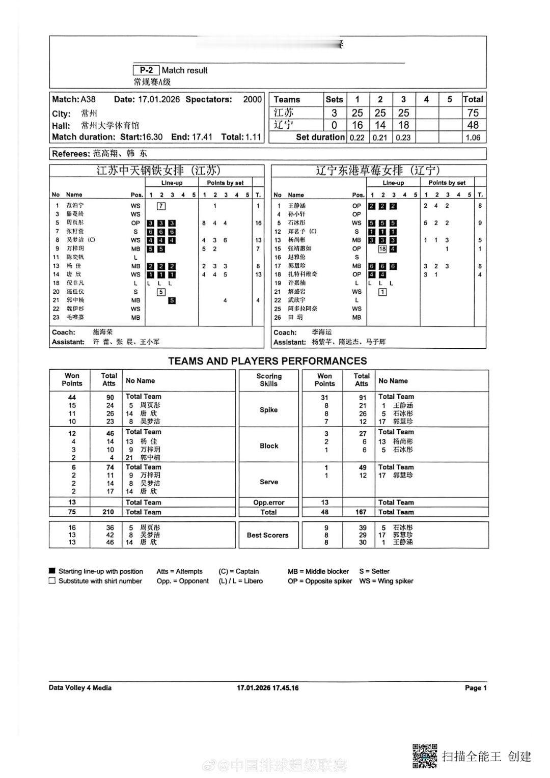 2026年1月18日-2025-2026CBA常规赛第16轮(第一阶段第16轮) 廖三宁绝杀 广东98-99爆冷被北控绝杀(潜力赛:26-19)(广东男篮遭遇两连败)/江苏106-101爆冷加时战胜山东(潜力赛:21-20)(江苏男篮获得两连胜/山东男篮终结八连胜)/青岛87-76大胜浙江稠州(青岛男篮获得四连胜/浙江稠州男篮终结五连胜)/四川79-103吉林(潜力赛:13-19)(吉林男篮终结三连败/四川男篮遭遇十六连负 继续一胜难求积分榜垫底)/浙江广厦109-82大胜广州(潜力赛:23-16)(卫冕冠军浙江广厦获得五连胜 继续领跑积分榜/广州男篮遭遇三连败) 2025-2026WCBA常规赛A组第17轮 (第一阶段第17轮) 江苏89-70大胜陕西(陕西女篮遭遇四连败)/上海89-84河北(石家庄)/北京71-90四川(上届亚军四川女篮获得七连胜)/浙江64-96山西(山西女篮获得六连胜 继续排名小组积分榜次席/浙江女篮遭遇六连败 继续排名小组积分榜垫底) B组第16轮 江西69-78福建(福建女篮终结九连败 继续排名小组积分榜倒数第二/江西女篮继续小组积分榜垫底)/河南85-79大连(辽宁)(河南女篮获得两连胜 暂列小组积分榜第三/辽宁女篮客场被双杀 遭遇两连败 继续暂列小组积分榜次席 付金秋21分/库珀16分/麦伊莎12分/王钊琦11分) 2025-2026女排超级联赛A级常规赛第一阶段第10轮 河南0-3上海(15-25 15-25 22-25)(上届亚军上海女排获得五连胜/河南女排遭遇四连败 继续排名小组积分榜倒数第二)/江苏3-0辽宁(25-16 25-14 25-18)(上届季军辽宁女排遭遇两连败 继续排名小组积分榜垫底)/福建2-3惜败天津(25-23 16-25 22-25 25-17 11-15)(天津女排终结两连败/福建女排继续排名小组积分榜第六)/山东3-0北京(25-21 31-29 25-23)(山东女排获得两连胜 暂时升至小组积分榜第三) B级第11轮 广东(深圳)3-0河北(25-11 25-18 25-20)(广东(深圳)女排获得七连胜 继续领跑小组积分榜/河北女排遭遇六连败 继续排名小组积分榜倒数第二)/四川1-3江西(25-27 27-25 24-26 28-30)(四川女排遭遇两连败)/浙江3-0云南(25-15 25-22 25-15)(浙江女排获得两连胜 继续排名小组积分榜次席) 2026亚足联U23男足亚洲杯1/4决赛 李昊第四轮扑点 乌兹别克斯坦点球大战2-4中国(常规时间+加时:0-0 点球大战:2-4 中国U23男足再次突破更进一步 晋级半决赛 半决赛将对阵越南)/澳大利亚1-2韩国(韩国半决赛将对阵日本) 部分重点赛事预告:CCTV5直播:13:55世界职业拳王争霸赛 16:30 2025-2026男排超级联赛A级常规赛第一阶段第10轮 上海-天津 19:30 2025-2026CBA常规赛第16轮(第一阶段第16轮) 上海-新疆 CCTV5+直播: CCTV5客户端直播:15:30/19:00(2场) 2025-2026男排超级联赛A级常规赛第一阶段第10轮 辽宁-河北/*广东-山东/浙江-北京 15:30(2场)/16:30 B级第11轮 江苏-云南/福建-河南/四川-湖北 19:30 2025-2026CBA常规赛第16轮(第一阶段第16轮) *辽篮-深圳 其他:19:35(3场) 2025-2026CBA常规赛第16轮(第一阶段第16轮) 山西-福建/北京-宁波/天津-南京(同曦) 19:30/20:00 2025-2026WCBA常规赛A组第17轮 (第一阶段第17轮) 武汉-东莞(广东)/新疆-山东