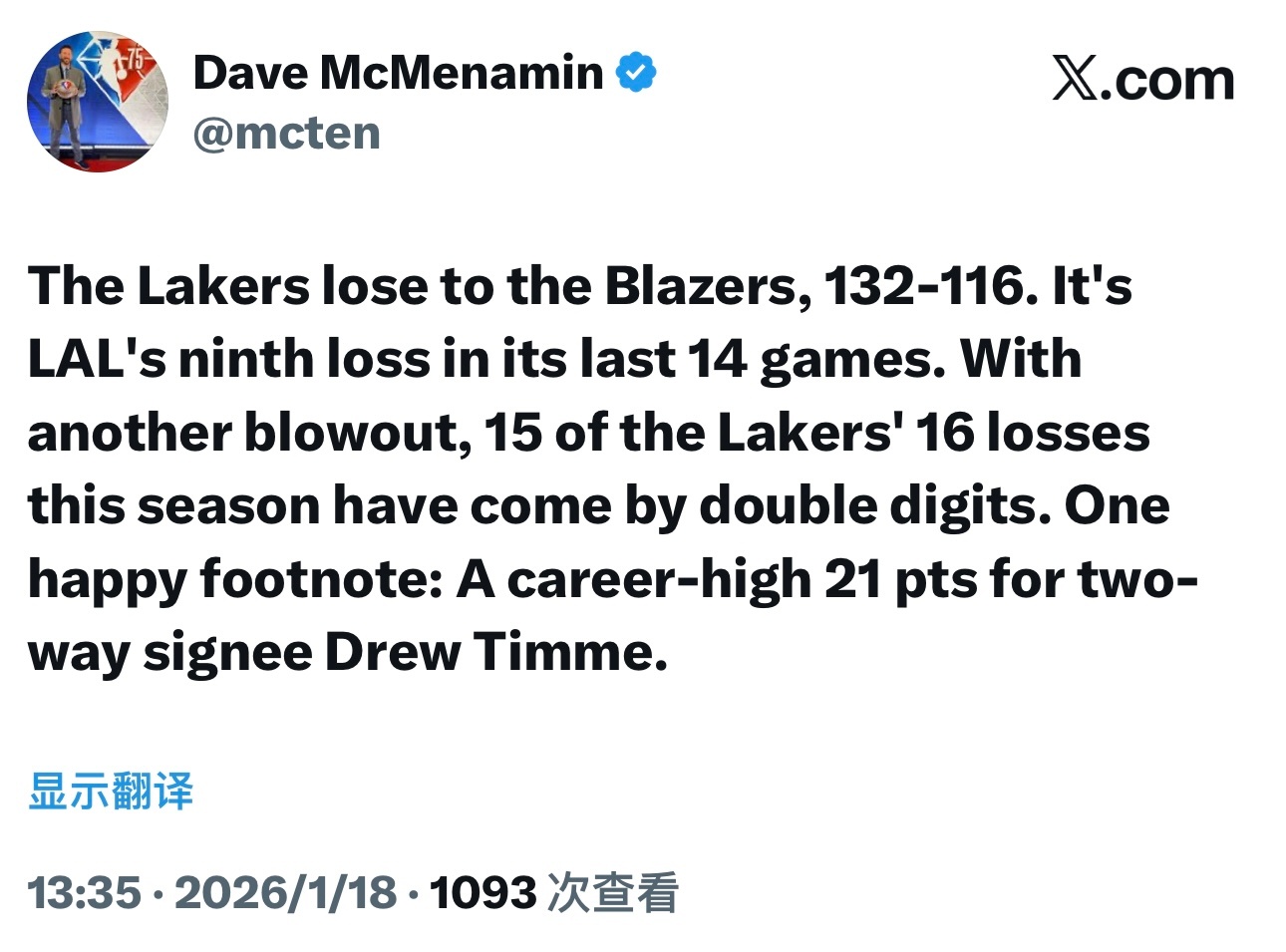 记者Dave:湖人又一场惨败,本赛季16场比赛中15场输了两位数分差!