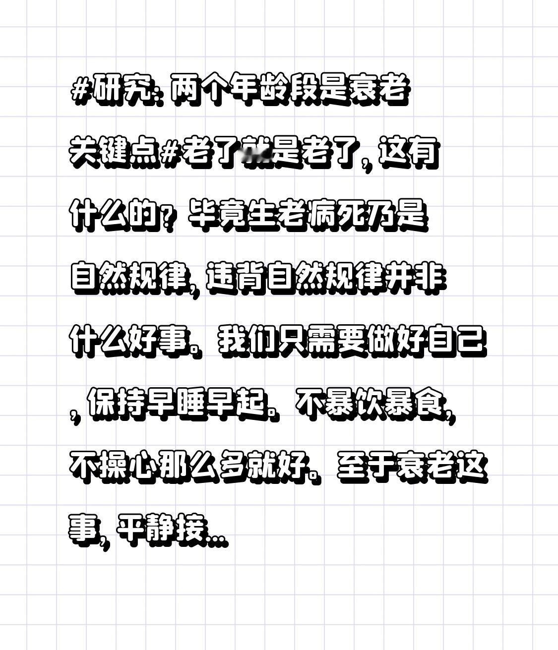 我们只需要做好自己,保持早睡早起。不暴饮暴食,不操心那么多就好。 至于衰老这事,