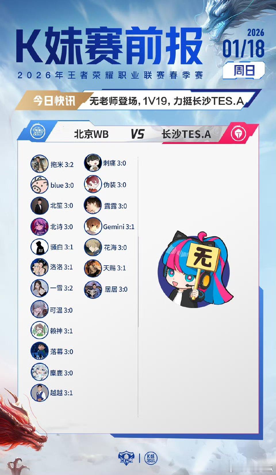 2026KPL春季赛|K妹赛前报5v14,更多嘉宾看好KSG;7v12,更多嘉宾看好济南RW侠;无老师登场,1v19力挺长沙TES.A。