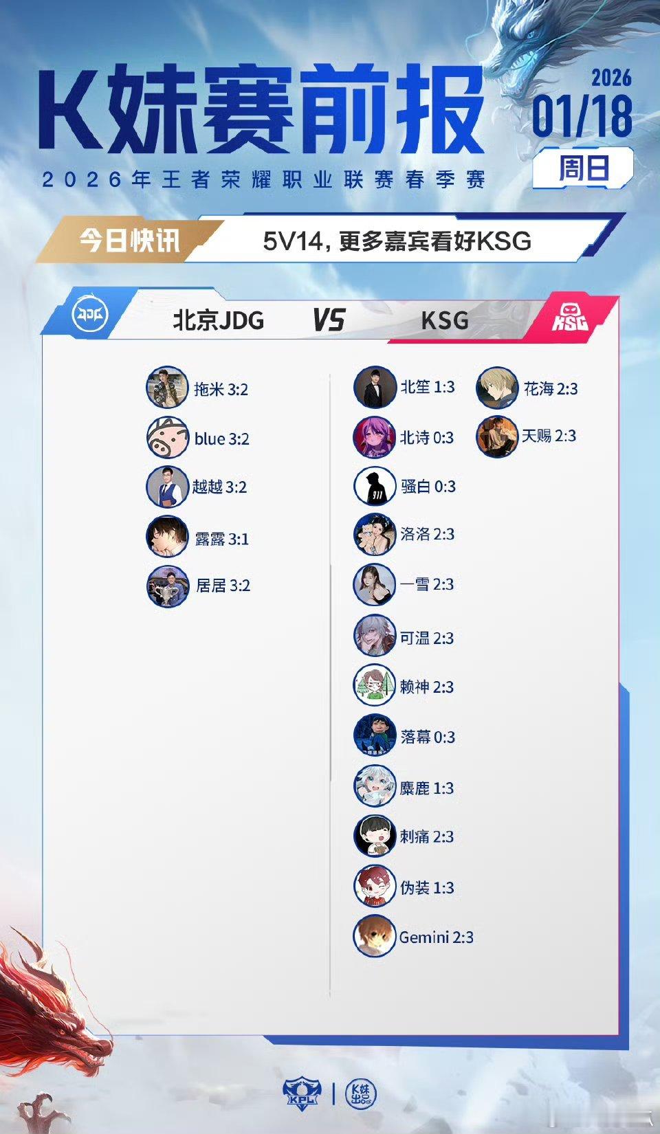 2026KPL春季赛|K妹赛前报5v14,更多嘉宾看好KSG;7v12,更多嘉宾