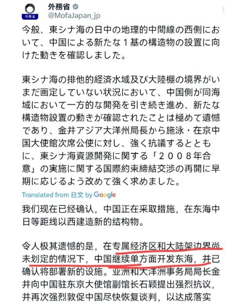 我们的动作越来越强势了,日本再次用抗议回应我们!1月16日,日本外务省声称,我方确认,中国近期正着手在东海日中所谓“中间线”西侧海域,新建一处设施。在东海专属经济区及大陆架界限尚未划定的情况下,中方持续在相关海域“单方面”推进开发活动,此番又确认到其新建设施的动向,我方对此深表遗憾。 可是,这根本站不住脚,所谓 “中间线” 本就是日方单方面主张,中国从未承认。根据《联合国海洋法公约》,东海大陆架自然延伸至冲绳海槽,中方开发完全合法。日本的抗议,纯属 “无理取闹”,太霸道。 其实,中方的动作早有信号,1 月 8 日就有消息称,东海 “春晓” 油气田周边新增钻井船,日媒当时就吵着 “被威胁”;如今确认的海洋观测设施,更是强化主权的实锤。这不是 “突然出手”,而是步步为营,早有规划。 殊不知,这恰是对日本的 “精准反制”。高市早苗刚发表涉台错误言论,还推动 “强军扩武”;中方连出禁令掐断其两用物项供应,东海动土更是补刀。等于给其 “强硬牌” 泼冷水,打得准,还够狠。 要知道,俄罗斯曾在北极推进设施建设,无视挪威抗议;韩国在独岛修建码头,日本除了抗议啥也做不了;澳大利亚曾反对印尼海域开发,最终只能认栽。主权问题上,实力才是硬道理。 不过,日本的处境太尴尬,自民党支持率已跌至 29.7%,在野党还在合纵逼宫;对华稀土依赖度超 70%,中方还在收紧中重稀土审查。所谓 “抗议”,只是演给国内看的戏码,自欺欺人。 此外,这处设施的意义不一般,它能实时监测水文与船舶动态,配合周边的雷达站,形成 “东海感知网”。等于给日方的小动作装了 “监控”,一举一动全被看透,无处遁形,太妙了。 对此,白宫仅说 “关注局势”,没提 “支持日本”。毕竟刚被加拿大 2000 亿大单 “摆了一道”,盟友体系松动,压根没精力管东海的闲事,自顾不暇。 换个场景看,清末的中国无力护海,被列强随意瓜分;如今军舰游弋、设施林立,正是实力的见证。落后就要挨打,强大才能护权,古今一个理,没毛病。 深一层看,这本质是 “霸权思维的末路”,日本还想靠 “单方面主张” 抢利益,却没算到中国早已今非昔比。所谓 “中间线”,早成了没人认的 “废纸”,不值一提,太可笑。 另外,菲律宾、马来西亚等国均依大陆架原则划界,间接认可中方立场。日本的抗议,成了没人附和的 “独角戏”,太冷清,没人理。 说到底,主权问题不容含糊,实力够硬才能腰杆直。日本的 “小脾气”,在绝对实力面前啥也不是。 以上是小编个人看法,如果您也认同,麻烦点赞支持!有更好的见解也欢迎在评论区留言,方便大家一同探讨。