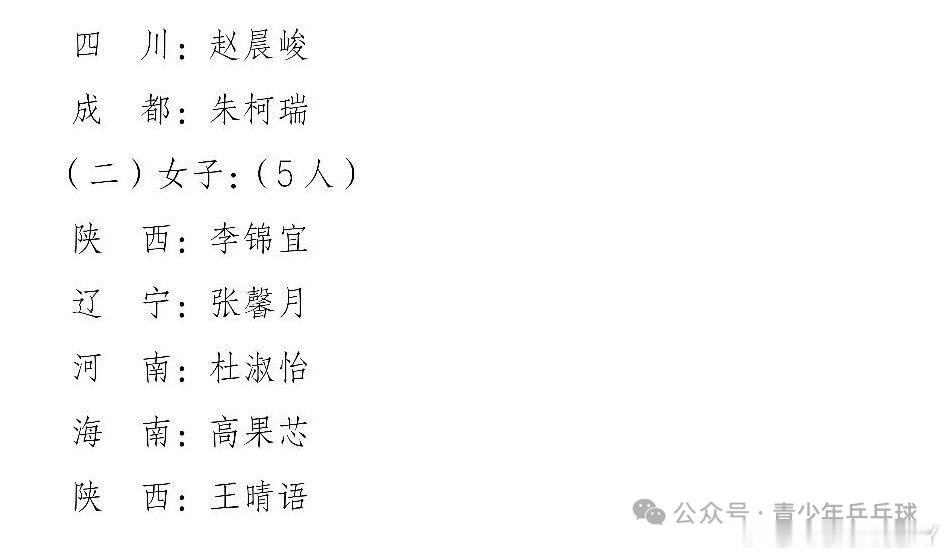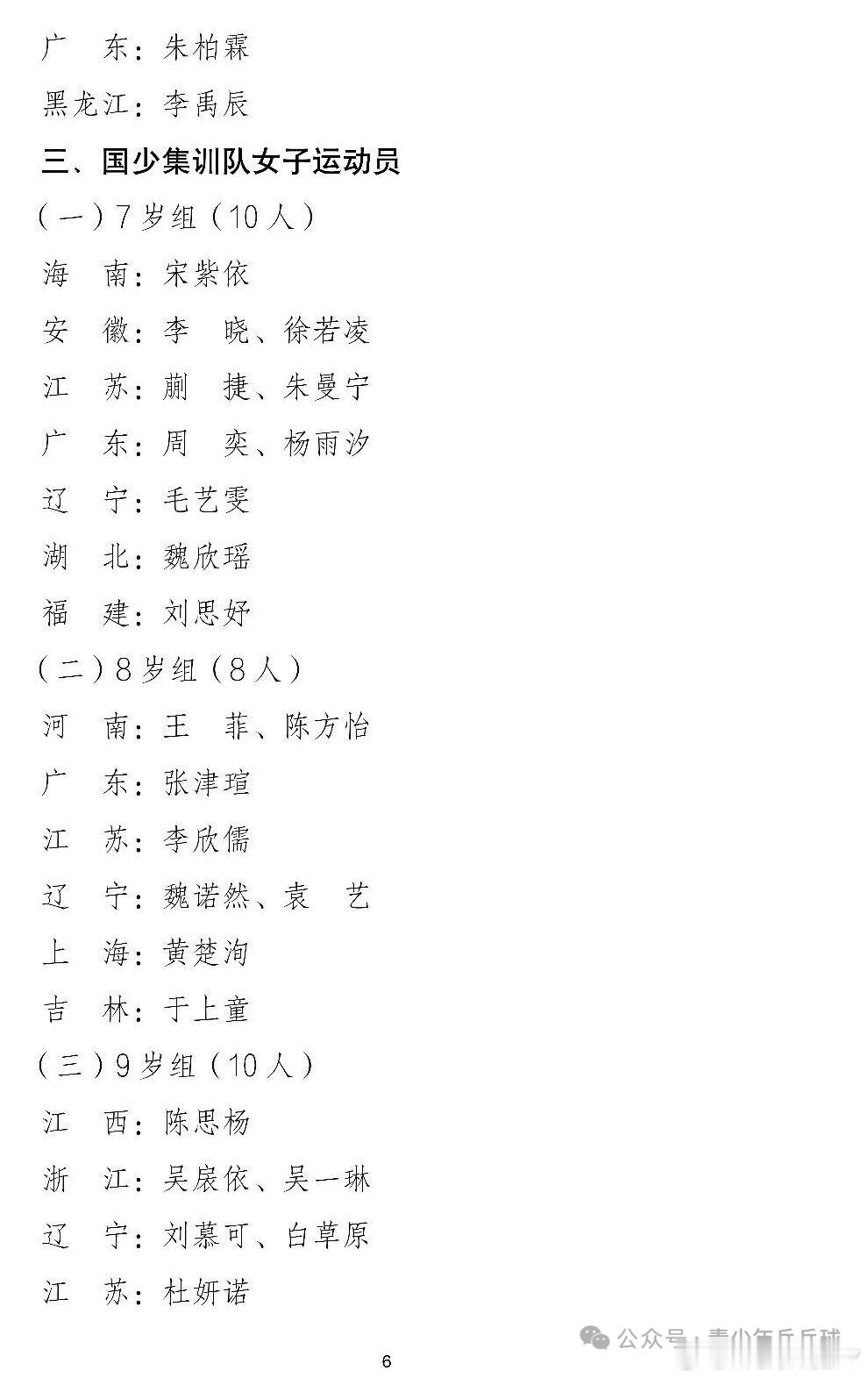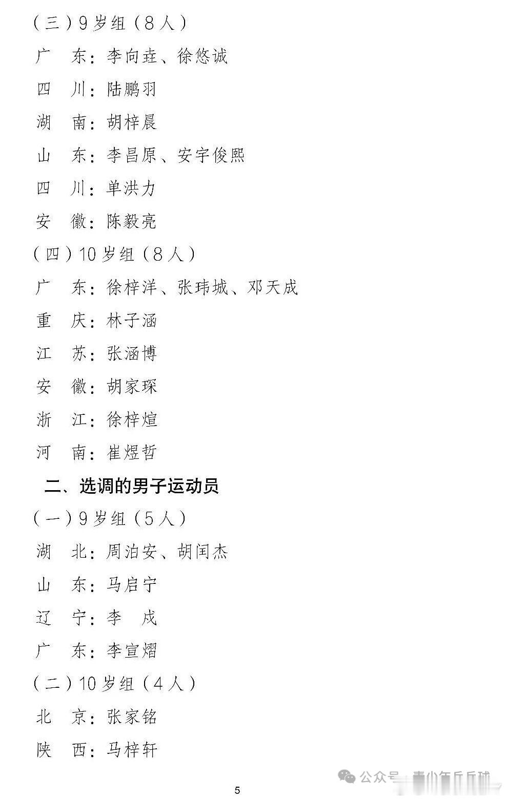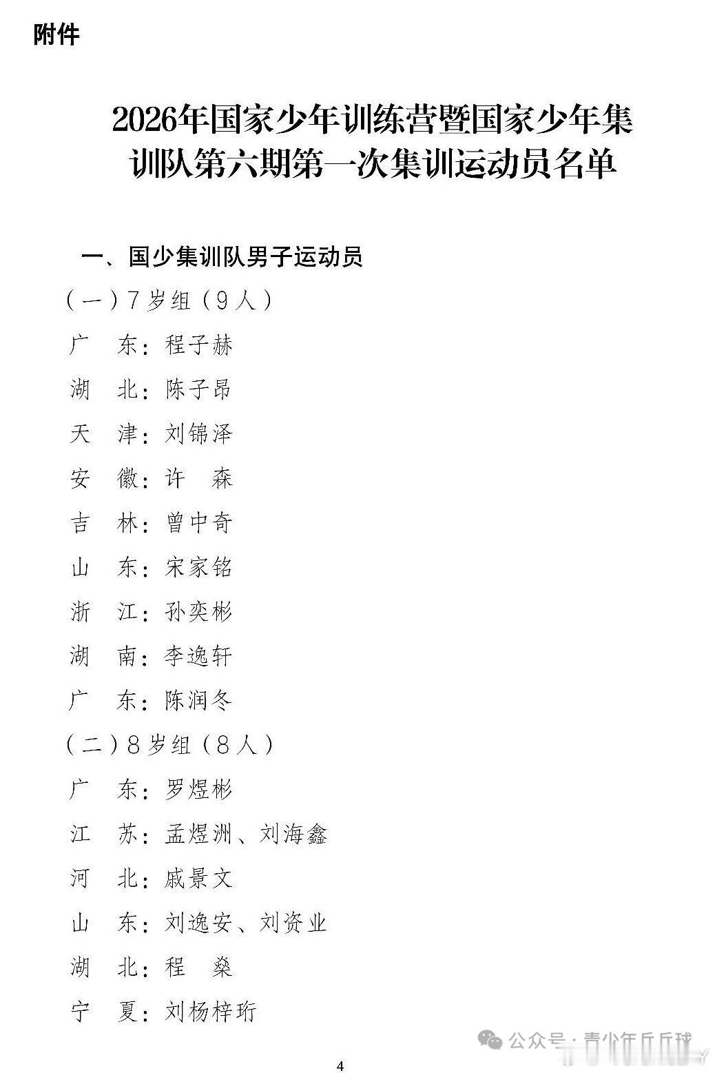 2026年国少队第一次集训名单·广东队运动员男子组7岁:程子赫 陈润东8岁:罗煜彬9岁:李向垚 徐悠诚 李宣熠(选调)10岁:徐梓洋 张玮城 邓天成 朱柏霖(选调)女子组7岁:周奕 杨雨汐8岁:张津瑄9岁:徐阡棠共14人广东队教练两人男队:潘烙珲(深圳)女队:于泽阳(广东)集训时间:1.26-2.12集训地点:山东威海训练基地