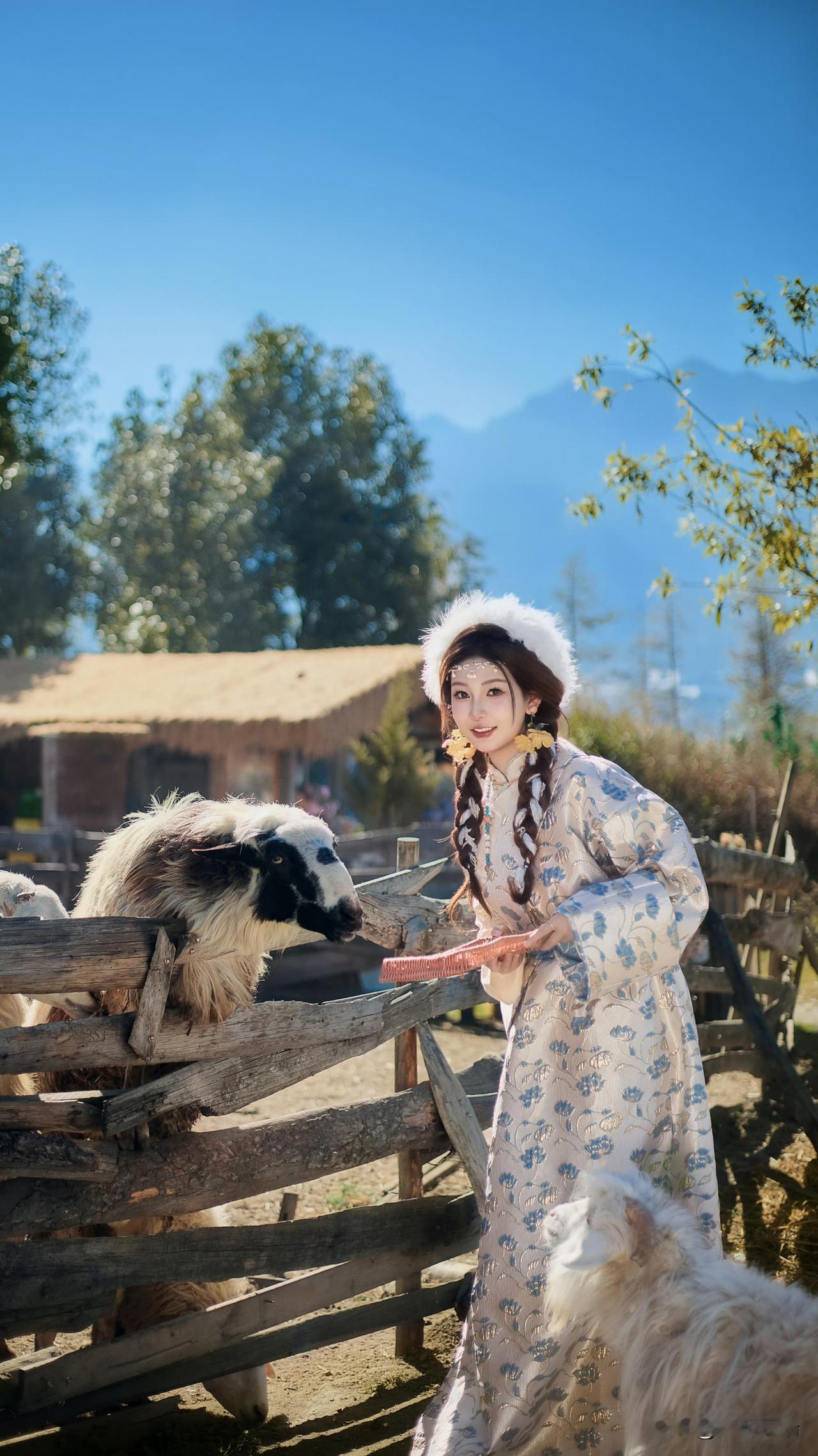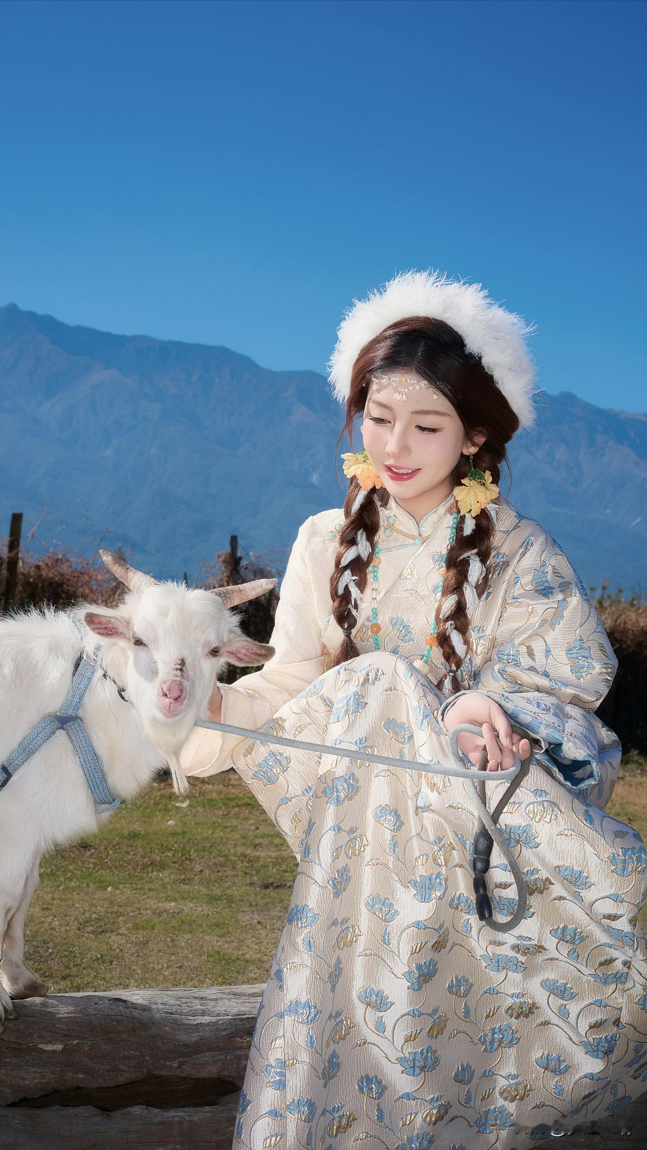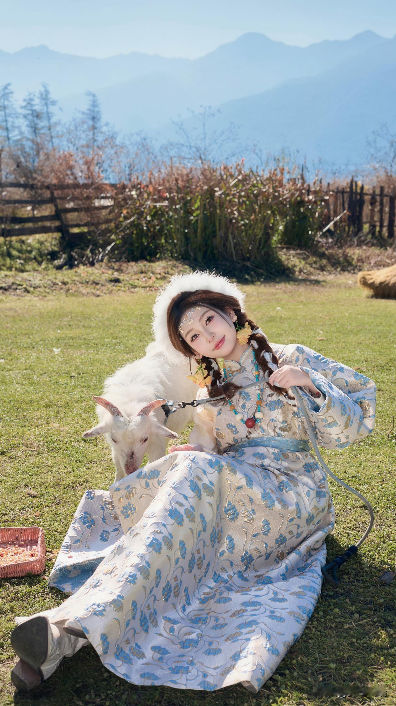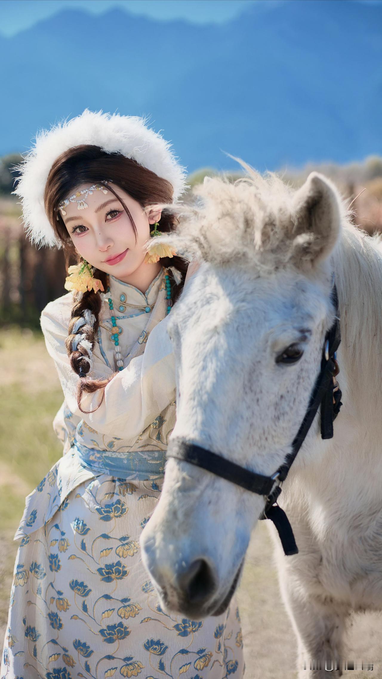 大山脚下草地上的白马与少女,美如画卷。