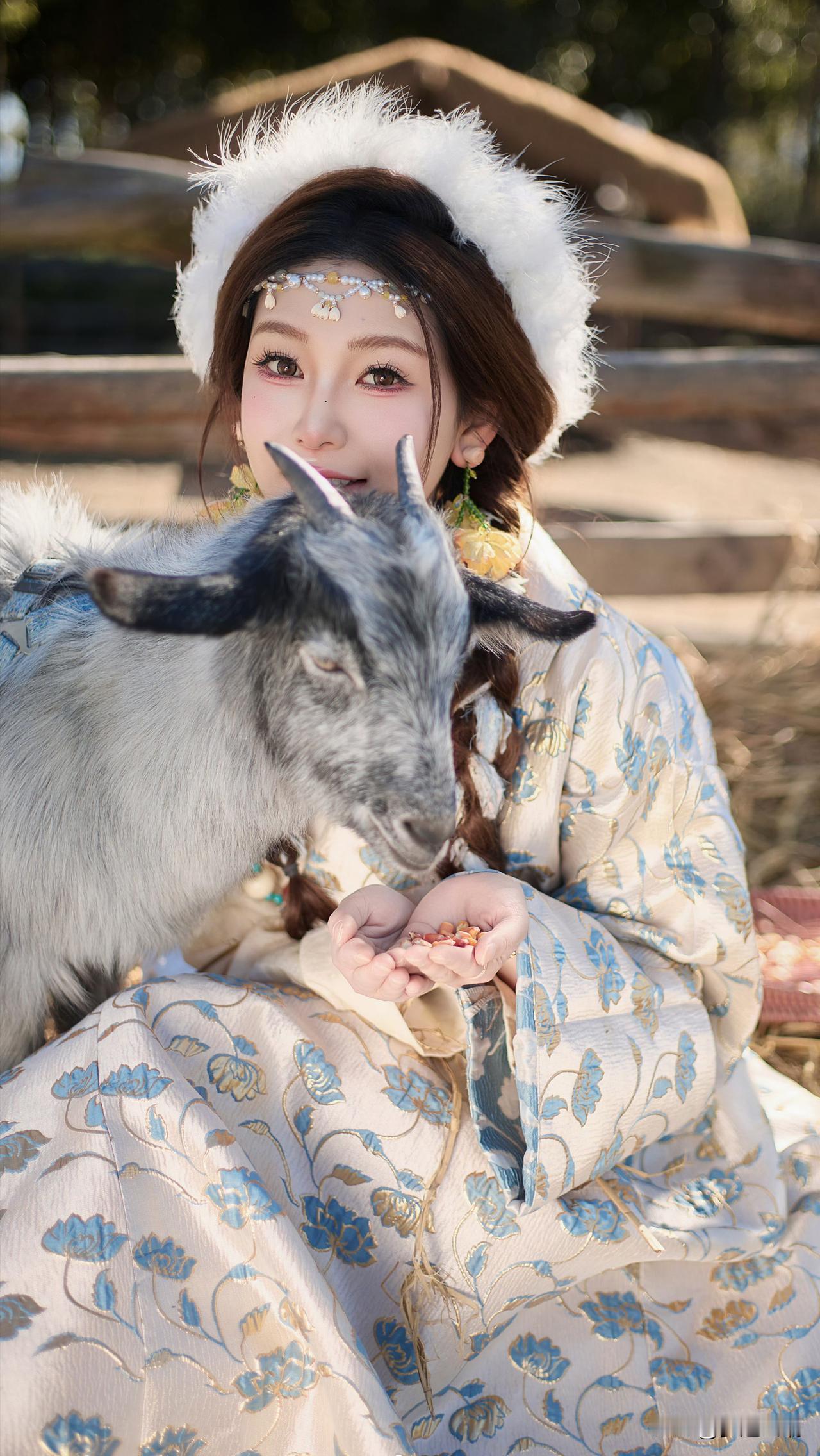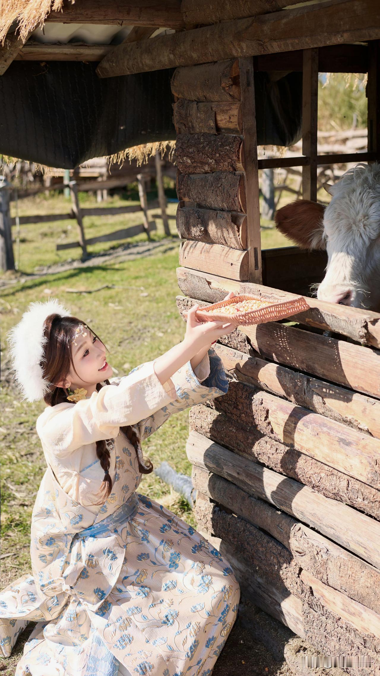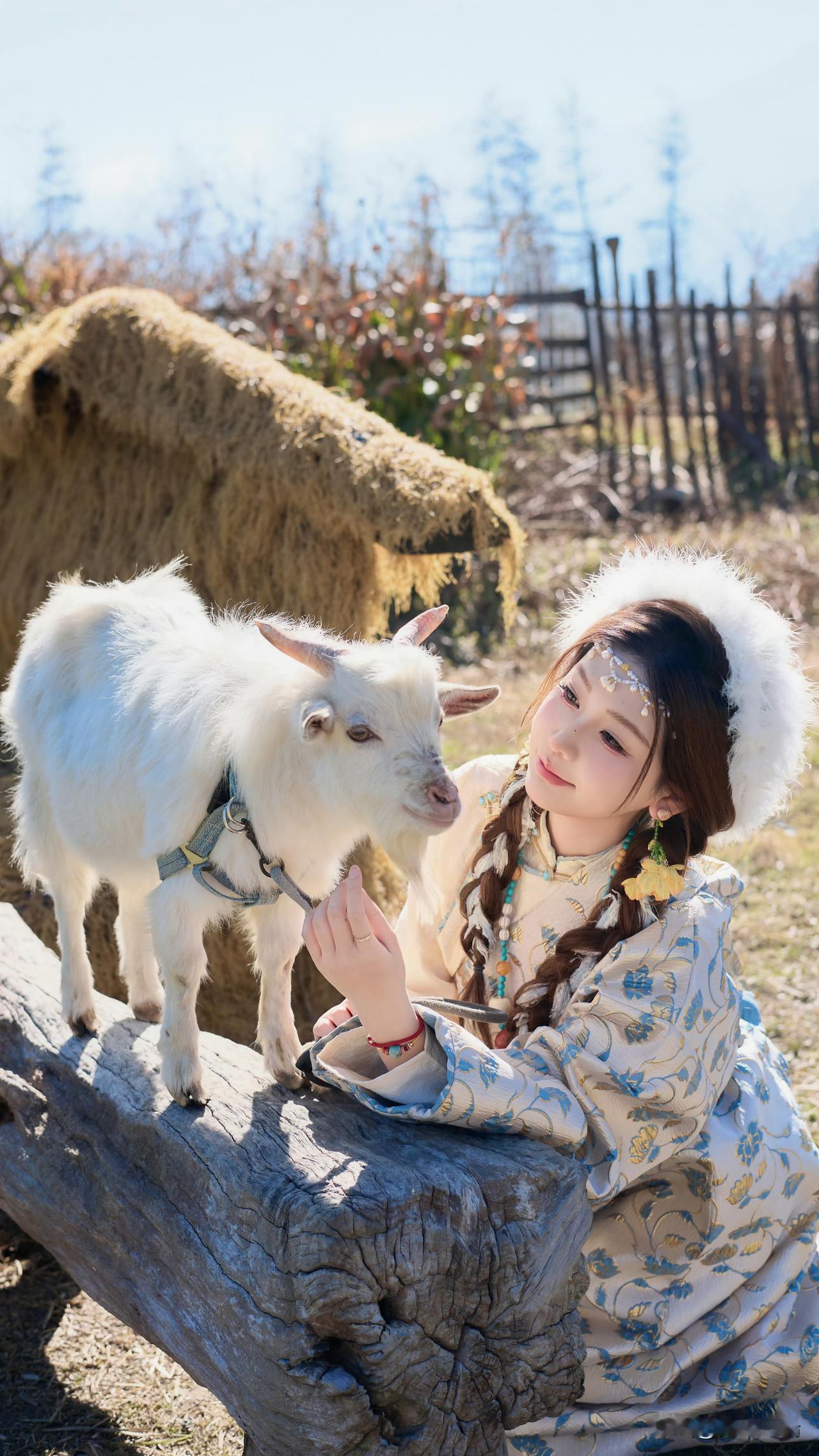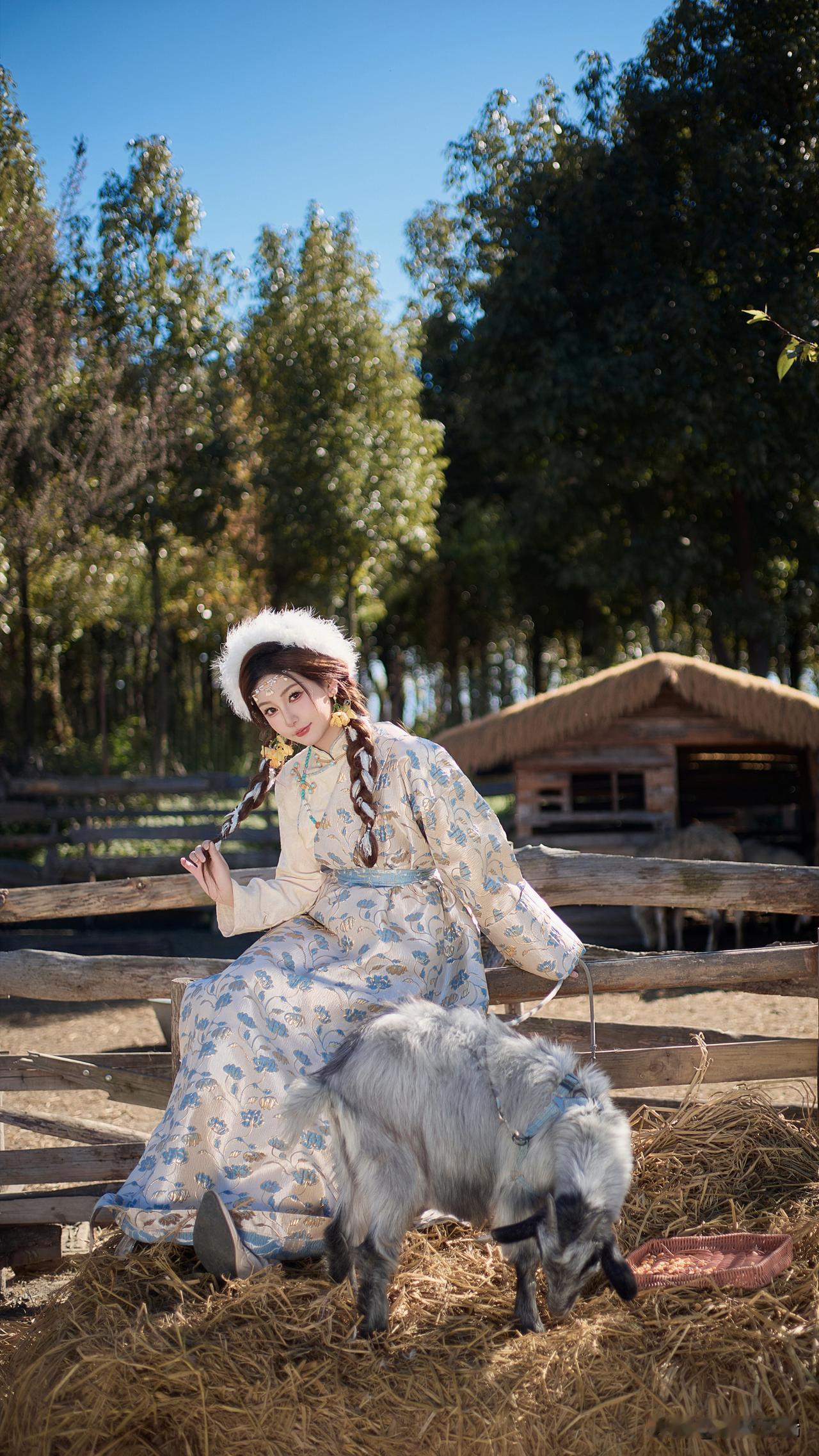 大山脚下草地上的白马与少女,美如画卷。