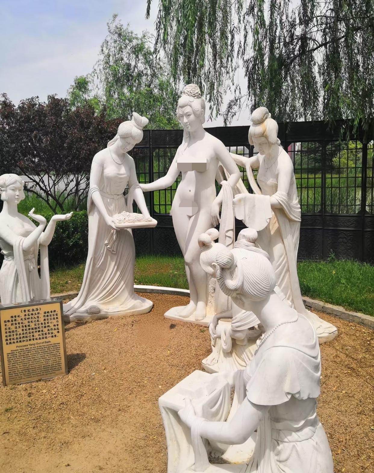 裸露不是问题关键, 披着"艺术"的外衣在公共场所合适吗? 国外似乎没有拿某位国王的王妃的裸体来雕塑展览吧? 一般都是虚拟人物,这方面国内属实是走在前沿啊 裸体可以是神性,可以是觉醒,可以是抗争,可以是自在自由 但绝不是迎合某一群体想看的“出浴”,她可是杨贵妃呀 大概是1991年,在华清池就有很多人排着队摸贵妃雕像胸部 很难想象这么多年了,还是这样 这待遇还不如秦桧呢,贵妃头发盘的整整齐齐但却是裸体 这真的是艺术吗?穿上衣服就不是艺术了吗?