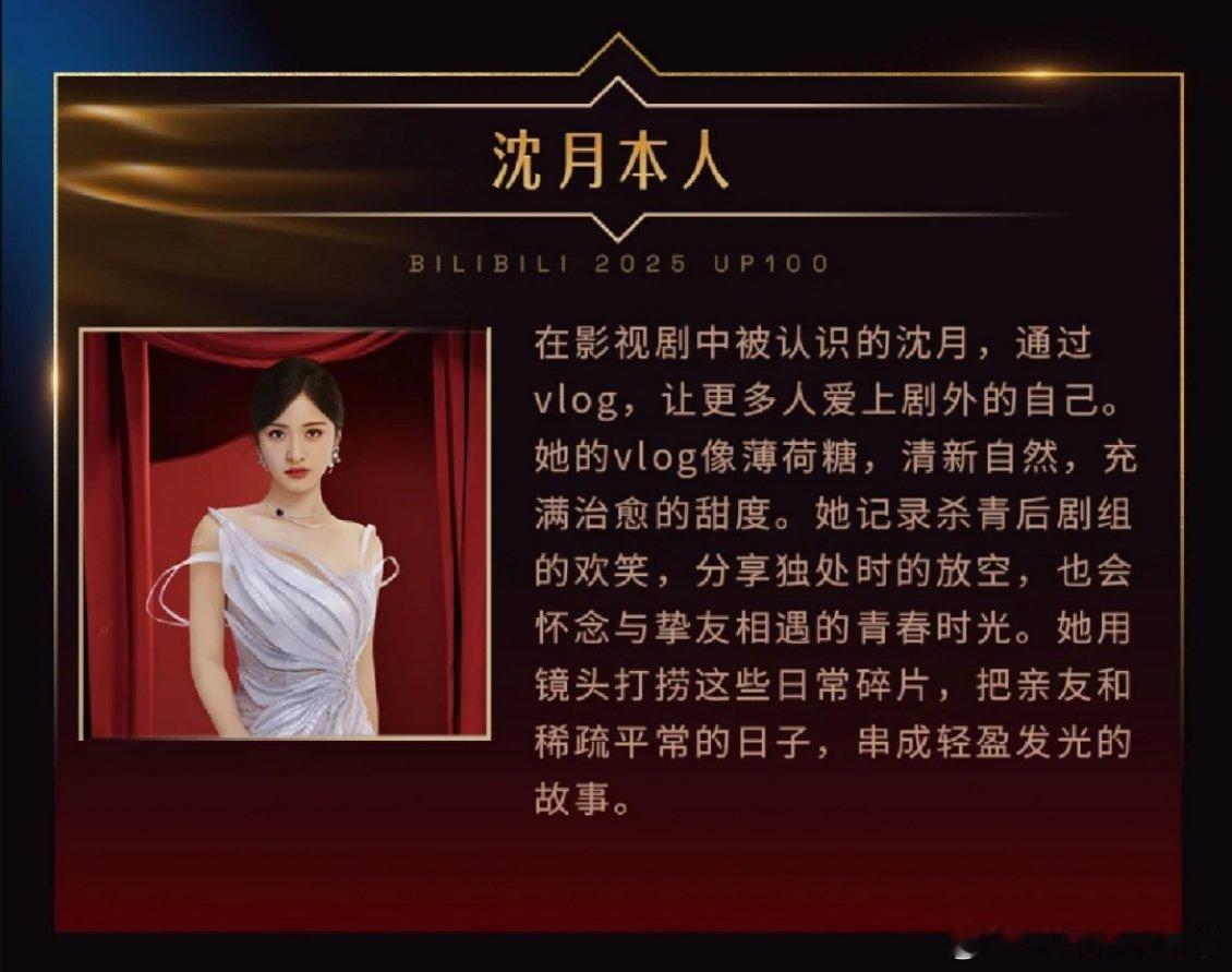 沈月沈月获得百大沈月获得2025百大up主 在影视剧中被认识的沈月,通过vlog,让更多人爱上剧外的自己。她的vlog像薄荷糖,清新自然,充满治愈的甜度。她记录杀青后剧组的欢笑,分享独处时的放空,也会怀念与挚友相遇的青春时光。她用镜头打捞这些日常碎片,把亲友和稀疏平常的日子,串成轻盈发光的故事。沈月撞档沈月
