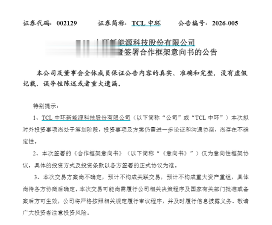 “本次签署的《合作框架意向书》仅为意向性框架协议,具体的投资方式及投资条款以各方签署的正式协议为准。”1月16日晚间,TCL中环相关人士回应了21世纪经济报道记者“是否会明确控股”的询问。