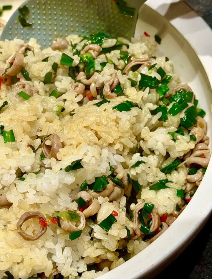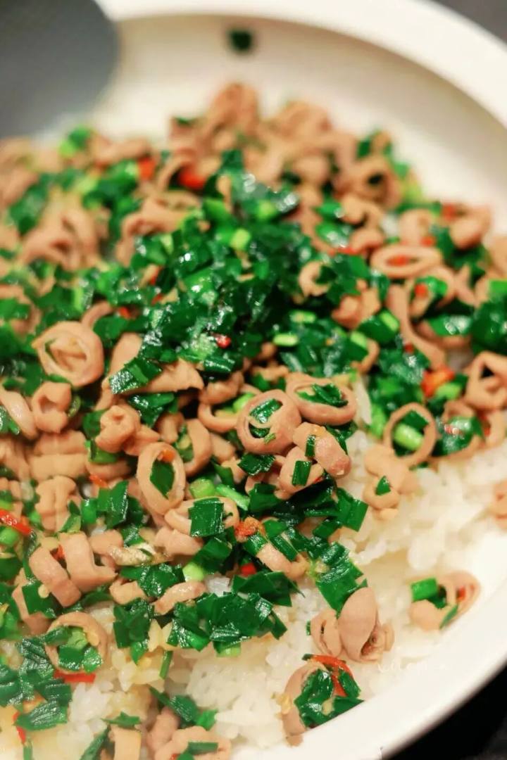 猪小肠切成细圈,用以捞饭,拌而食之,可与海肠捞饭媲美。