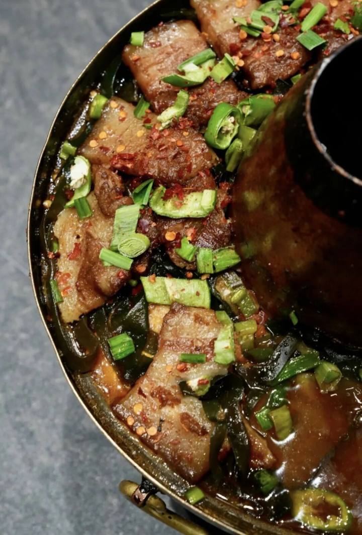 土猪肉用柴灶大锅炖煮,慢笃笃将猪油滗出,肥瘦相间,烂而不糜,腴润芳鲜,肉香丰沛。淳安地处浙西山区,山里温度低,烹制这道土猪肉,以淳安人习惯,不可免辣,以驱湿寒。