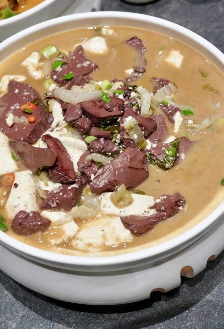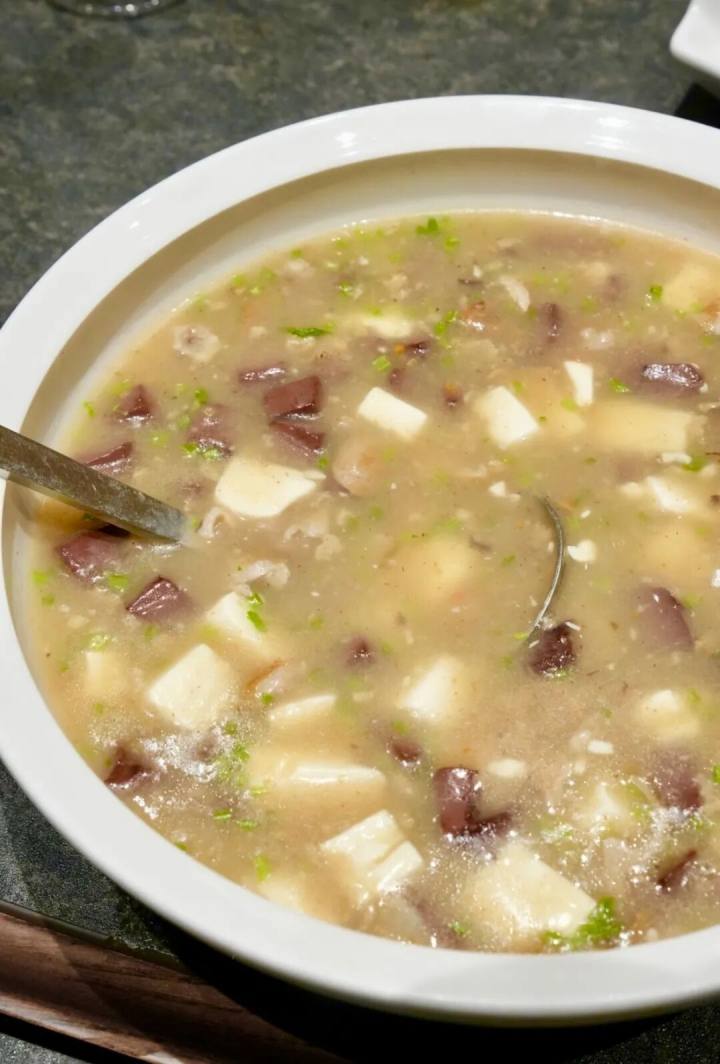 杀猪羹,以嫩豆腐与猪血为主角,辅以肉末、香芹,熬成一羹,滑嫩适口,一碗紧着一碗,不下三碗。