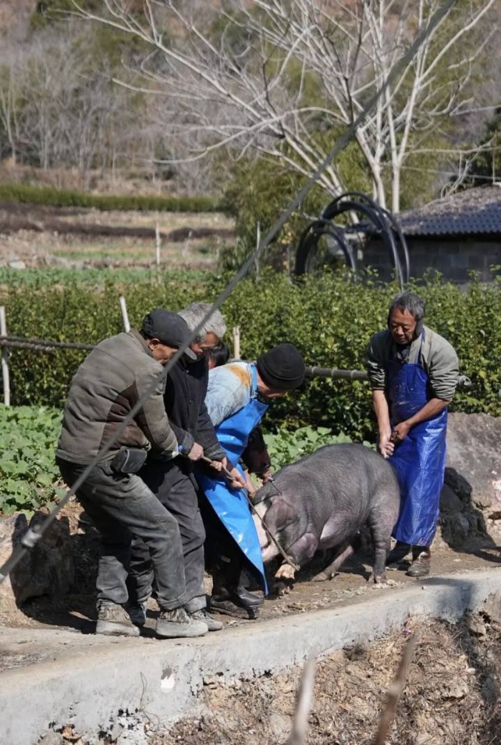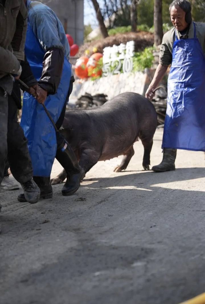 一头三四百斤的大肥猪,从猪栏里把这个大家伙拖出来,需要4个成年男子合力完成,猪叫连天。