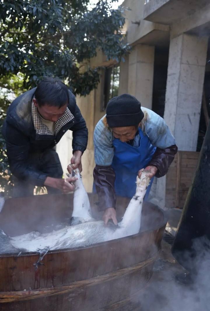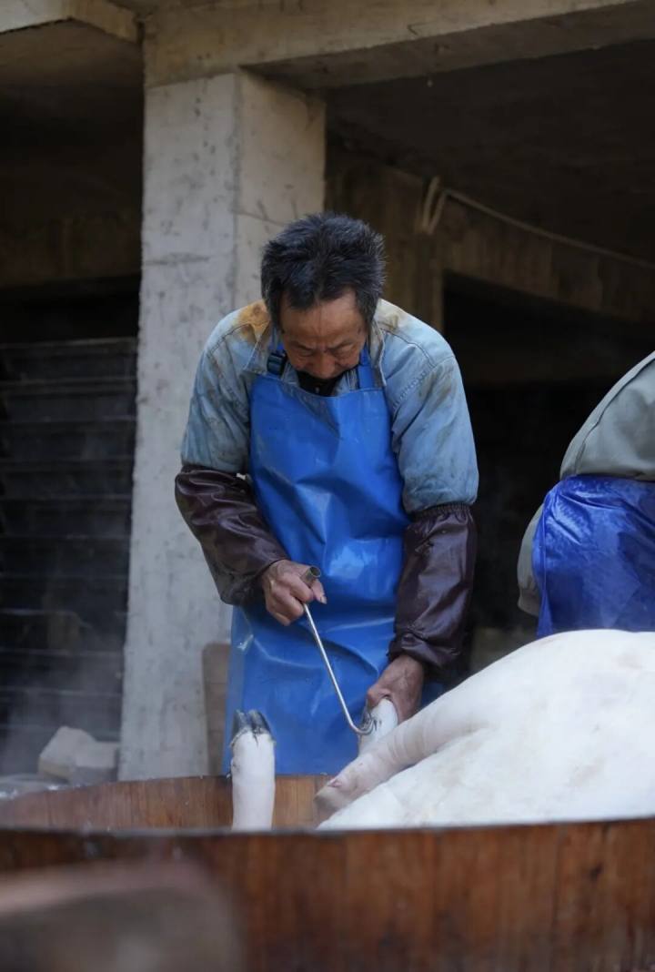 一个大木桶,放满滚烫的开水,刮刀所到之处,雪白的猪皮浮现。腋下毛最难煺,猪下桶泡开水的时候,脚缩牢了,这个部位毛浸泡不透,于是难褪。