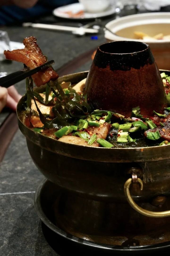 千岛湖特色暖锅是冬季必备,铜火锅,底下铺陈海带丝、高山萝卜、农家自制油豆腐、豆腐,最上面覆盖一层土猪肉,以炭火煨制,围炉而食,土猪肉将油脂赋予底下诸料,有润泽万物之恩。