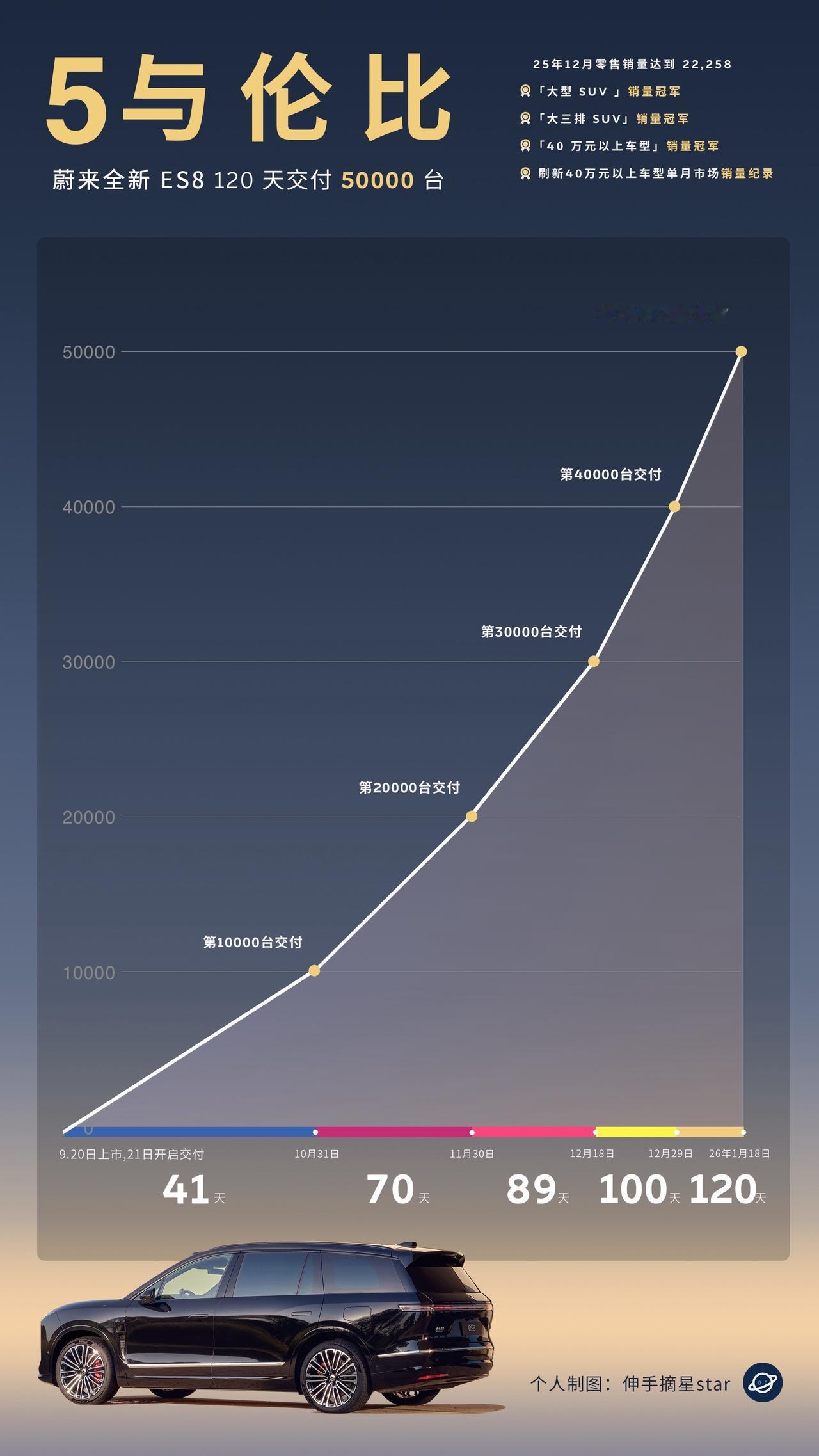 120天,交付破5万! 蔚来全新ES8 刷新了自己的历史记录! 刚刚过去的12月份, 新8零售销量达到 22,258 台, 同时斩获「大型 SUV 」、 「大三排 SUV」以及 「40 万元以上车型」 销量冠军, 刷新 40 万元以上车型单月市场销量纪录 现在ES8 就是稳态交付,月1.7-1.8W! 产能就是销量。 新能源汽车 蔚来全新es8 蔚来