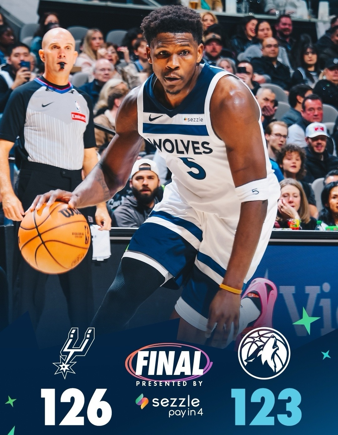 爱德华兹55分生涯新高森林狼vs马刺 NBA常规赛森林狼对阵马刺,上半场森林狼落
