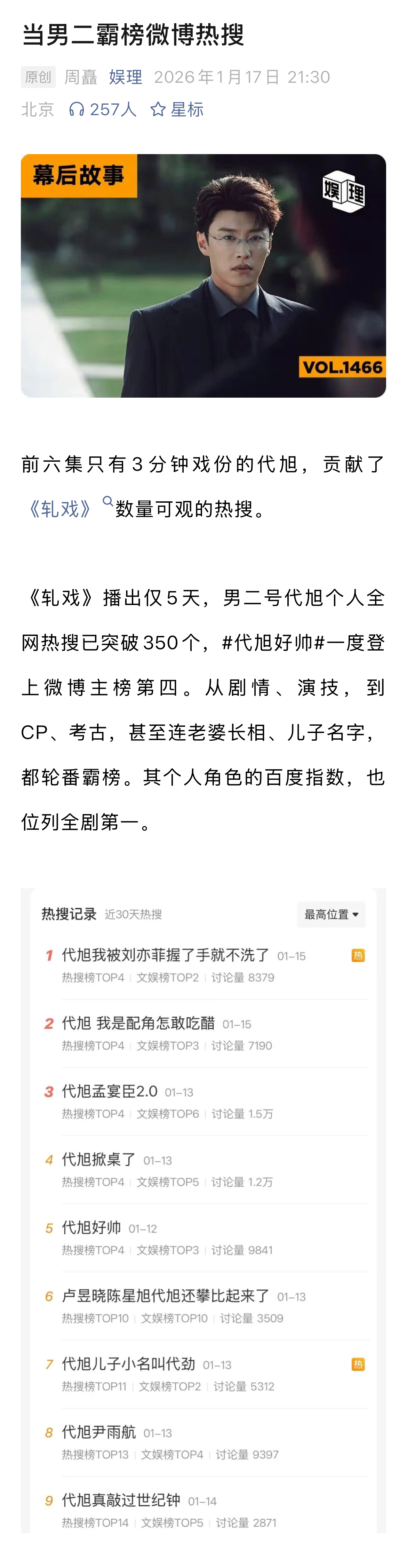 业内谈代旭走红上桌编剧称很多男配人设比男主讨喜 前六集只有3分钟戏份的代旭,贡献了《轧戏》数量可观的热搜。随着角色的火热,《轧戏》的站内热度、市占率也直线上涨,云合评级达到S+级。这不是偶像剧里第一个出圈的男配。从《香蜜沉沉烬如霜》中的罗云熙,《我的人间烟火》中的魏大勋,再到《云之羽》中的丞磊、田嘉瑞,《长相思》中的邓为、檀健次等,他们均用不多的戏份,制造了剧集最多的热度。这意味着,编剧笔下不被女主角选择的男二,不一定不被观众选;而角色戏份多少、番位前后,也不再和受欢迎程度成正比。戏份不多的“代旭们”,为何能火得如此迅速、猛烈?他们的出圈背后,又是哪些观剧情绪的涌现?请戳娱理独家...↓