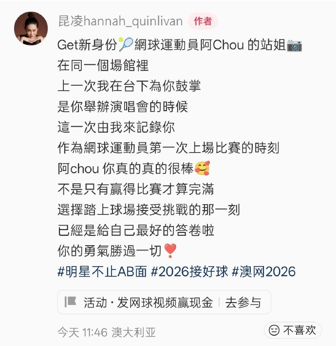 昆凌同步分享儿子罗密欧陪伴周杰伦参加澳网比赛的视频,强化家庭凝聚力。