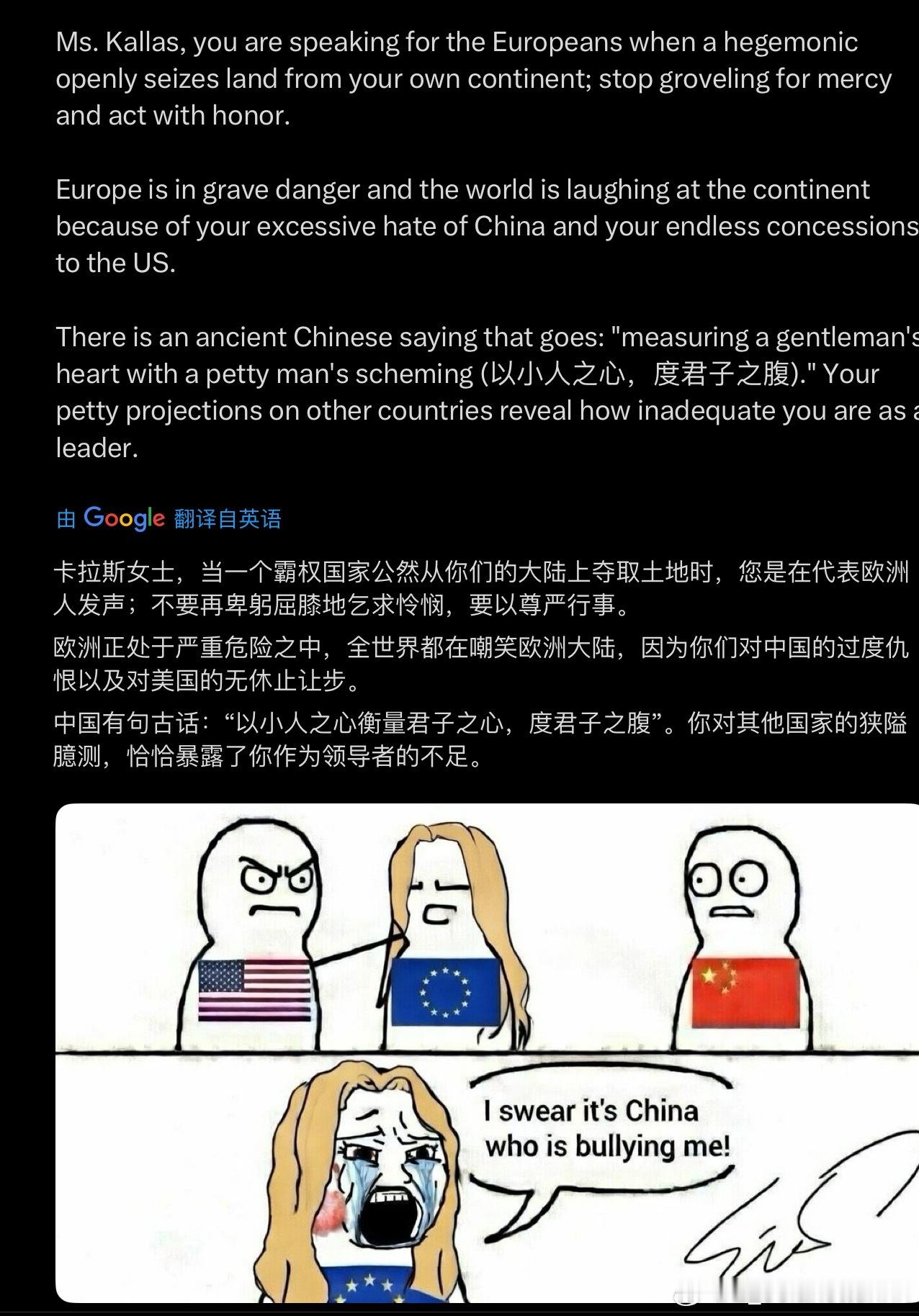 特朗普因格陵兰岛向欧洲8国加税欧盟卡拉斯:“阿美不要打我们了啦,格陵兰岛的问题咱们北约内部解决呀都怪中国不好,中国现在肯定乐开花了”阿美都要收你领土了,你还“北约内部解决”呢?卡拉斯毫无政治才能,上台全靠炒作俄乌局势和家族势力,如今世界大乱没人关心她唯一的“政绩”了,她就打算捆绑着欧洲和她一起沉沦。老中此刻:不熟勿cue