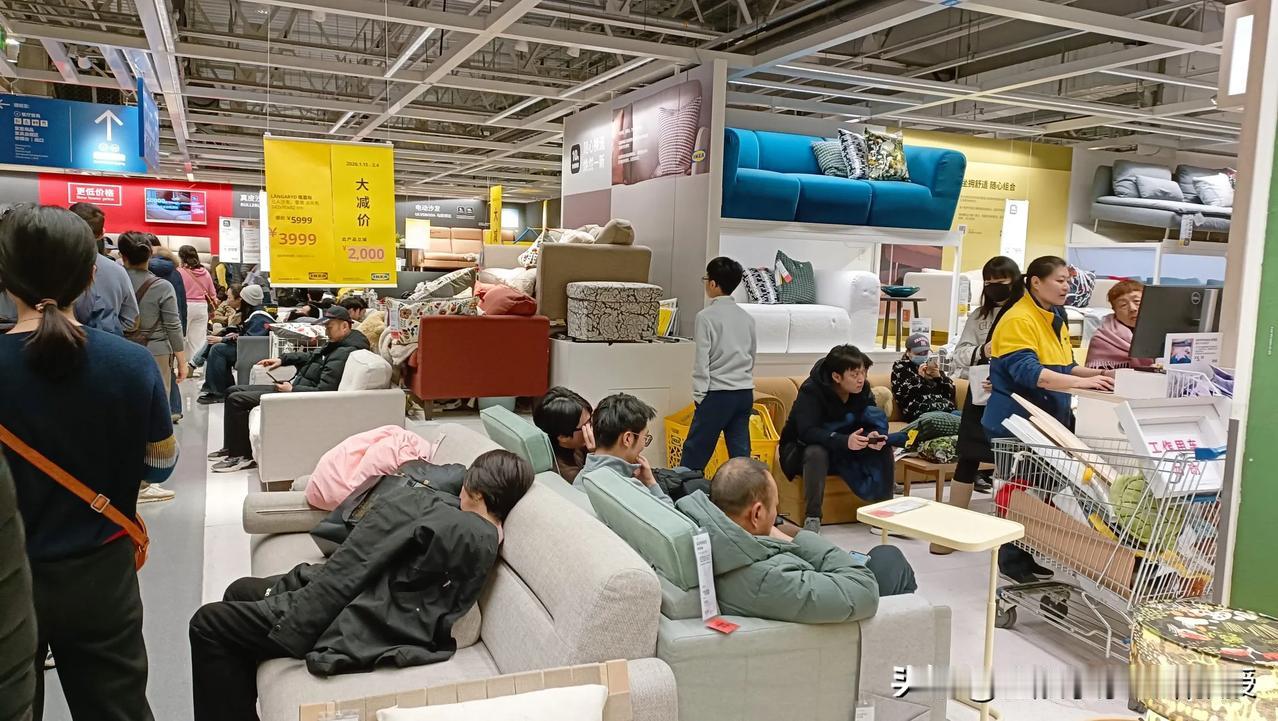 看下图,这就是周六北京荟聚的宜家,人山人海却不买单!宜家中国撤店潮真相。 一边是撤店传闻刷屏,一边是周末卖场人山人海——沙发上躺满睡觉、聊天的中老年人,试坐区座无虚席,门口的“大减价”在显眼处,但收银台门可罗雀。宜家真的已经变成商场里的休闲区了。 最新数据显示:宜家中国2024年净利润同比暴跌超60%,截至今天已累计关店14家,三年前的“加速开店”计划彻底停摆。曾经的家居流量王,如今陷入“只逛不买”的尴尬:低价引流难抵消费疲软,体验式营销沦为“蹭空调、躺沙发”的公共休息区。 宜家模式真的已经走到尽头了吗?