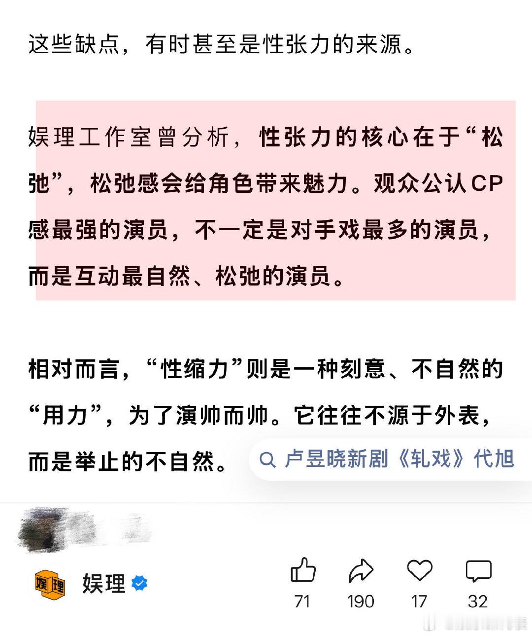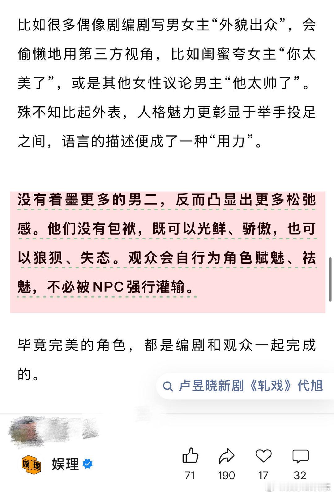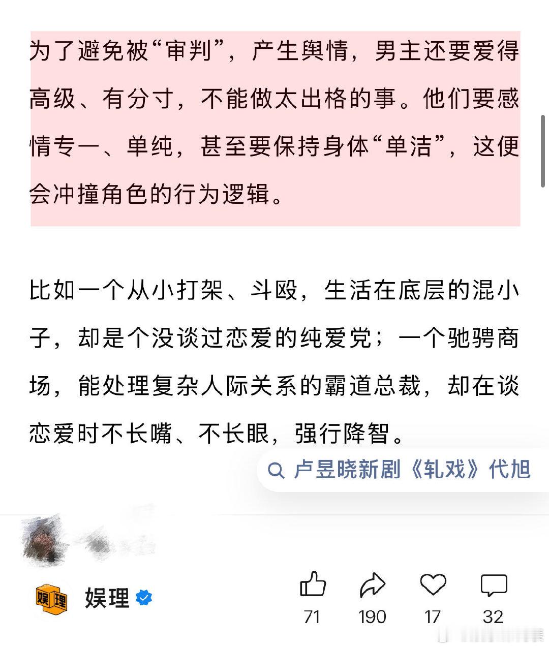 业内谈代旭走红上桌 编剧称很多男配人设比男主讨喜 为了避免被“审判”,产生舆情,男主还要爱得高级、有分寸,不能做太出格的事。他们要感情专一、单纯,甚至要保持身体“单洁”,这便会冲撞角色的行为逻辑。而男配的作用是提供情感支点,为推进主角情感服务。这些缺点让男二们更完整,更真实,更像现实存在的人。娱理独家↓