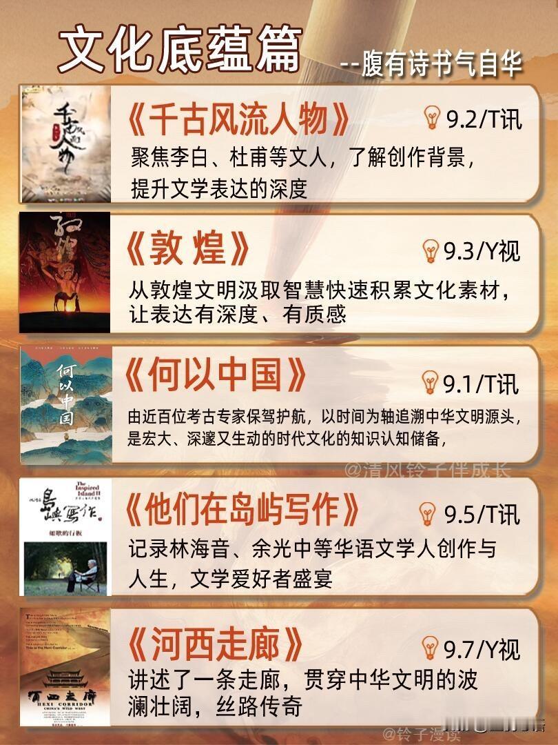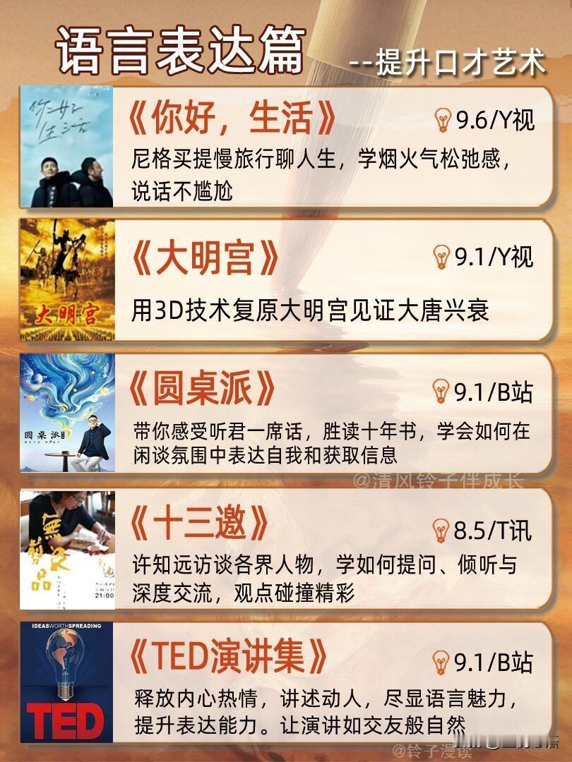 嘴笨表达差? 40部纪录片帮你逆袭 有没有姐妹跟我一样? 心里有话说不出,一开口就卡壳。 重要场合脑袋空白, 想分享观点却语无伦次,真的太尴尬! 别愁啦! 这40部纪录片就是“表达力救星”, 覆盖8大类别超实用。 想练口才看《你好,生活》《圆桌派》, 学人家怎么自然聊天; 想涨见识看《苏东坡》《西南联大》, 肚子有货才敢说; 想提逻辑看《脑力大挑战》, 说话有条理不混乱。 不用报昂贵课程,碎片时间刷一刷就行。 一边看风景、学知识, 一边悄悄提升表达力,性价比绝了! 好口才从不是天生的,都是慢慢积累来的。 把刷短视频的时间用来充电, 久而久之,你也能谈吐不凡,自信开口!