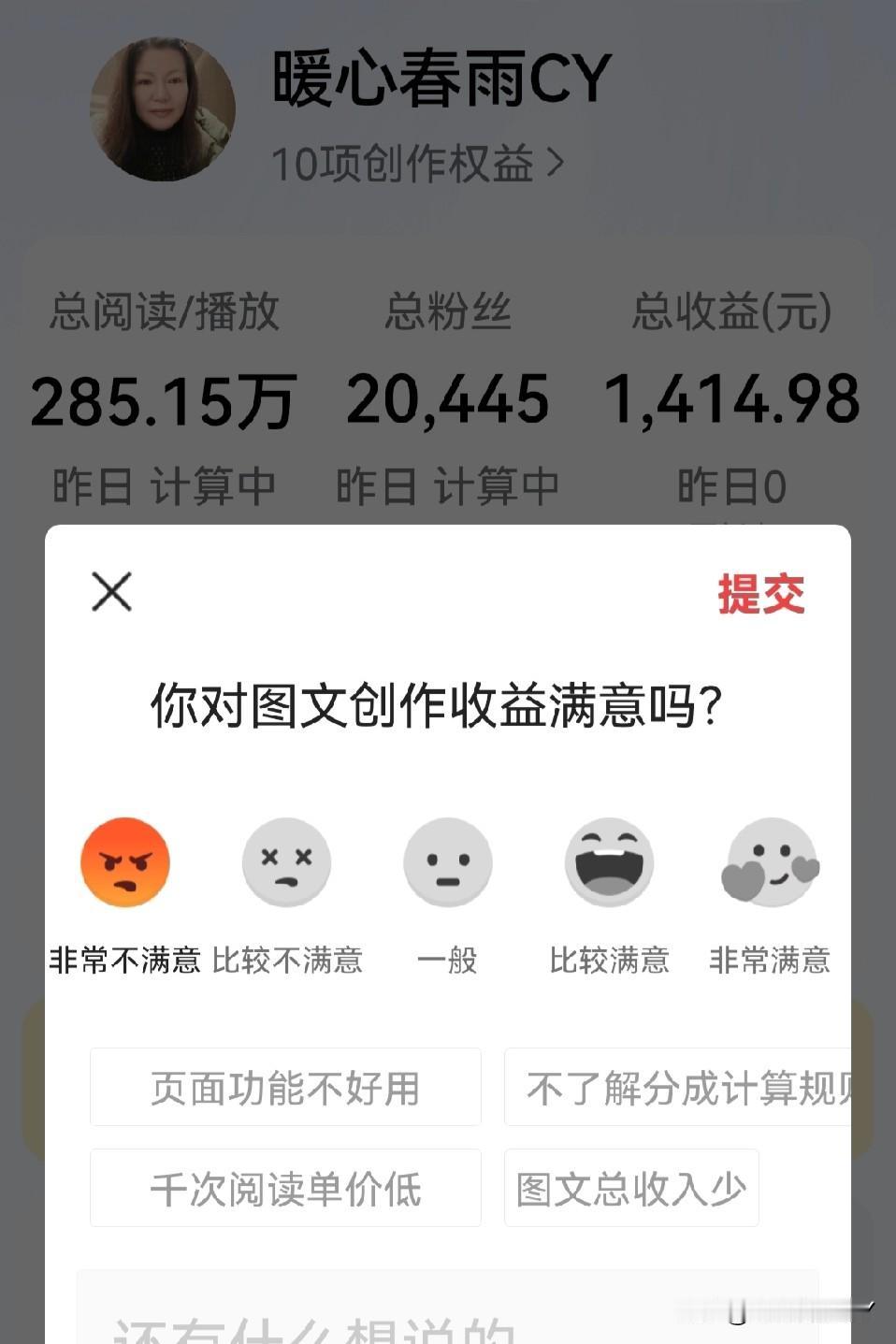 图文收益这差距,我真的破防了! 这两天我辛苦码字,还仔细研究了一番。16号,微头条阅读量达29386,涨粉20,创作收益7.65元,千次阅读收益才0.26元。 17号,阅读量为21841,涨粉19,创作收益4.88元,千次阅读收益仅0.22元。 系统还给我发图片询问:“你对图文创作收益满意吗”?我直接回复“非常不满意”后提交。 我常刷到网友晒收益,他们千次阅读最低收益0.35元,高的有几块甚至几十块,几千阅读量就能赚大几十,这对比太扎心了! 同样是熬夜写稿,为啥我的收益这么惨淡?现在我真的没干劲儿了,越想越迷茫…… 大家千次阅读收益是多少?有没有提升收益的干货技巧?