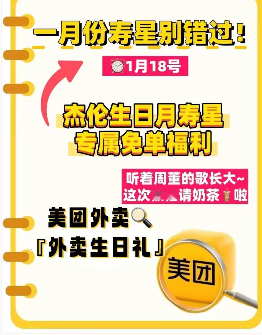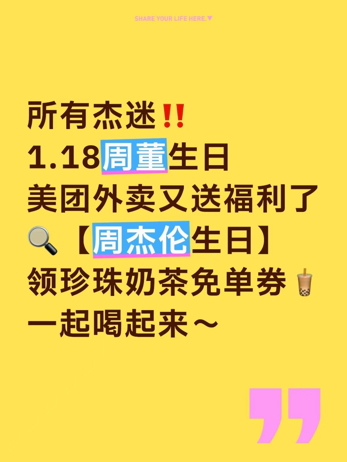 周杰伦请的奶茶救命!周董包了全网的庆生奶茶!美团输“外卖生日礼”,百万份免单珍珠奶茶在等你——一月寿星闭眼领,其他人也有份,这波必须给偶像排面,先喝为敬!