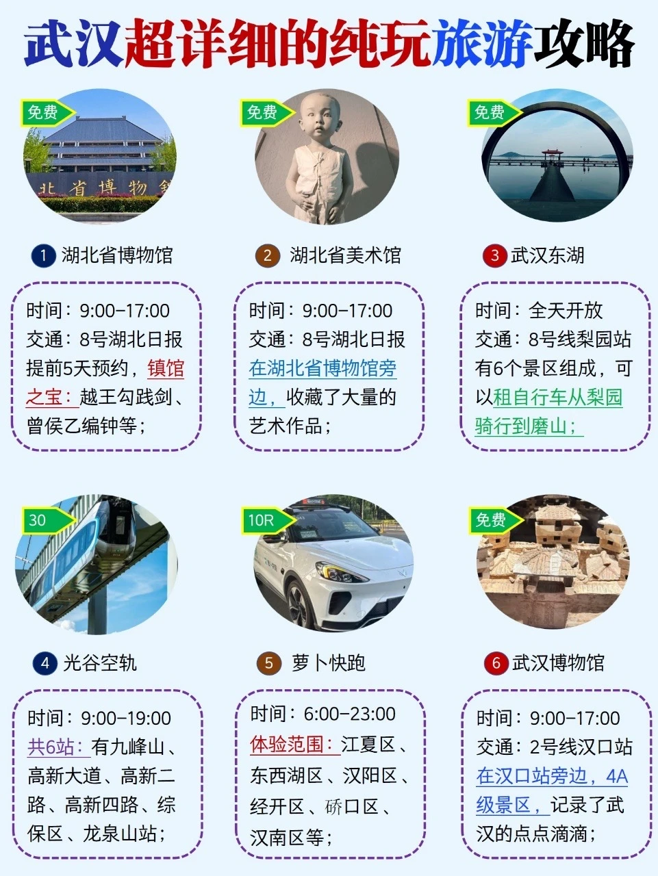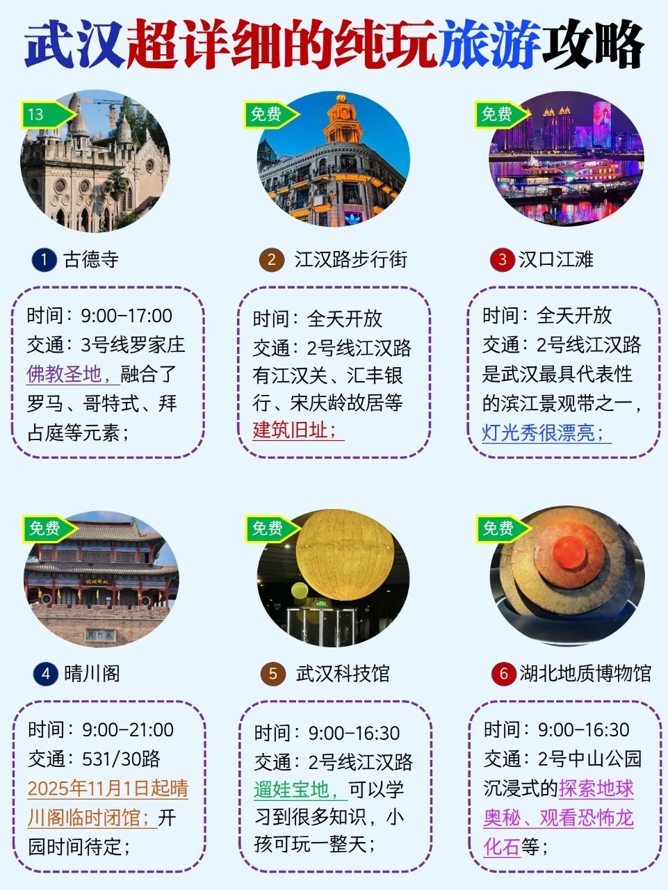 假期去哪玩 来武汉旅游,这些事情一定要知道 ‼️2025年11月1日起晴川阁临时闭馆; ‼️提前要预约的景点 ✅湖北省博物馆✅湖北省美术馆 ✅湖北省科技馆✅武汉科技馆 ✅湖北地质博物馆✅江汉关博物馆 ✅武汉桥梁博物馆👍武汉警察博物馆 👍武汉水生生物博物馆 ✅武汉横渡长江博物馆 ‼️武汉东湖很大由6个景区组成,建议大家先去东湖听涛,然后在租自行车骑行东湖绿道到磨山南门; ‼️武汉大学1月18日-2月28期间,游客刷身份证即可入校参观;正门进-凌波门出 ;然后再去湖北省博物馆、美术馆等;