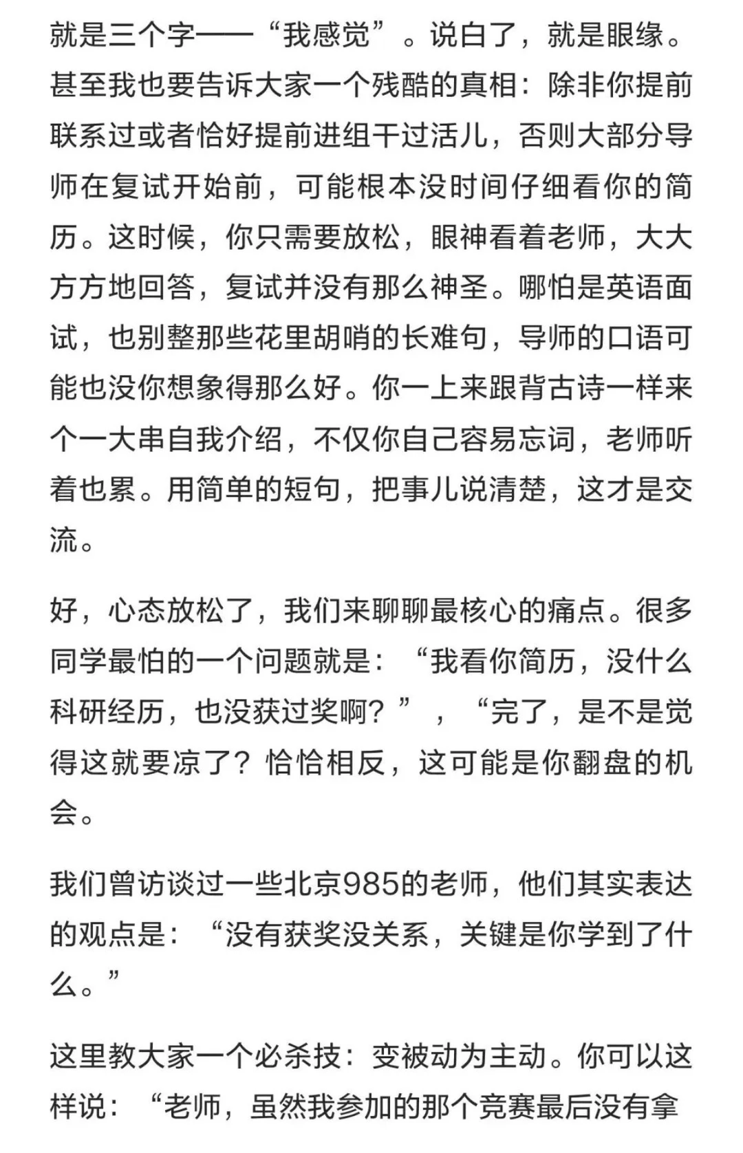 很多同学复试前焦虑,在背自我介绍模板,在纠结自己没有科研成果怎么办,甚至在算由于自己本科不好会扣多少印象分,看完这期视频,只要你记住一句话,焦虑能消减一半—一那就是“导师也是有血有肉的人,不是无情的打分机器。”面试不是考试不是审讯,而是一场双向奔赴。