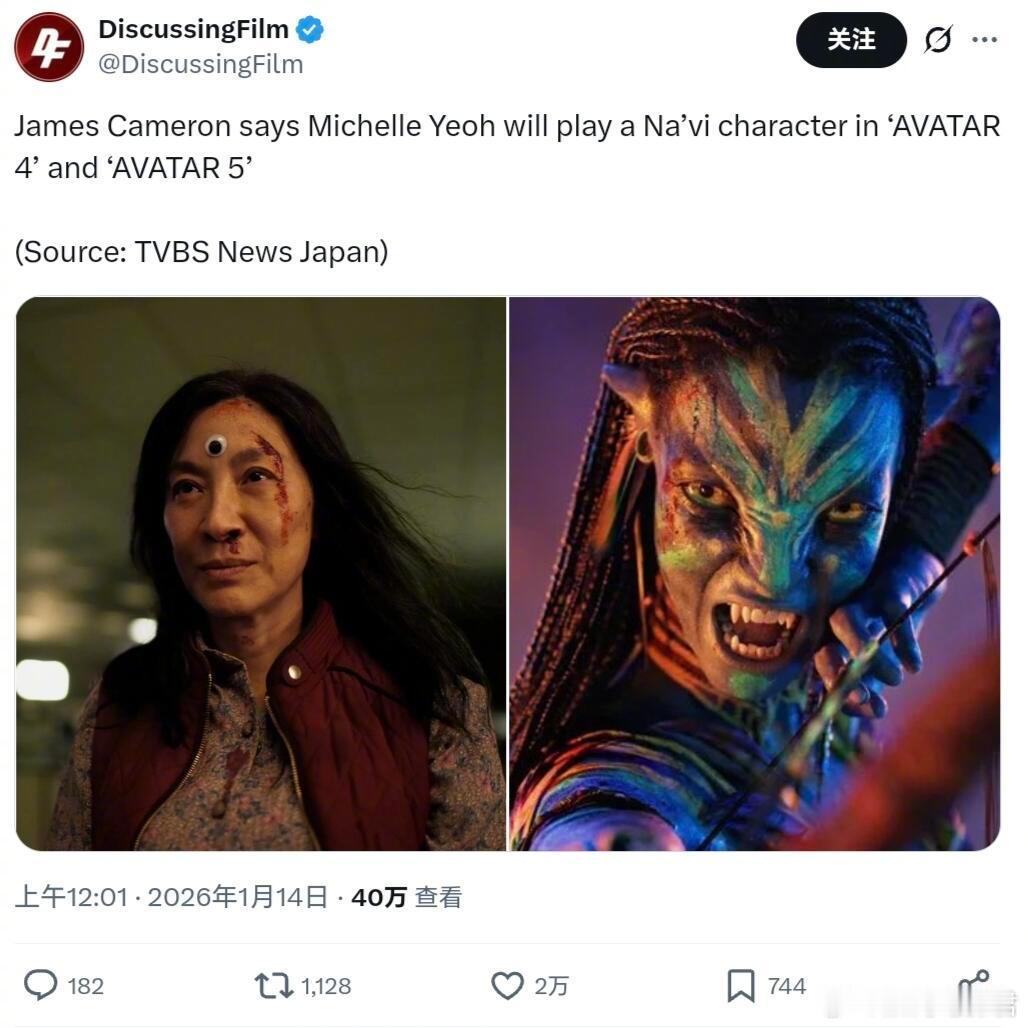 阿凡达 杨紫琼将扮演纳威人!卡梅隆在近期的采访中确认杨紫琼将出演《阿凡达4&5》,她将通过动作捕捉技术来饰演一名纳威人(而不是avatar或人类)。然而他也强调,当今电影产业急剧萎缩,而阿凡达电影制作成本很高,他们需要《阿凡达3》大卖,才能支撑续集的开发。之前有媒体报道杨紫琼的角色是一位人类科学家,现在来看卡梅隆应该是改写了这个角色!