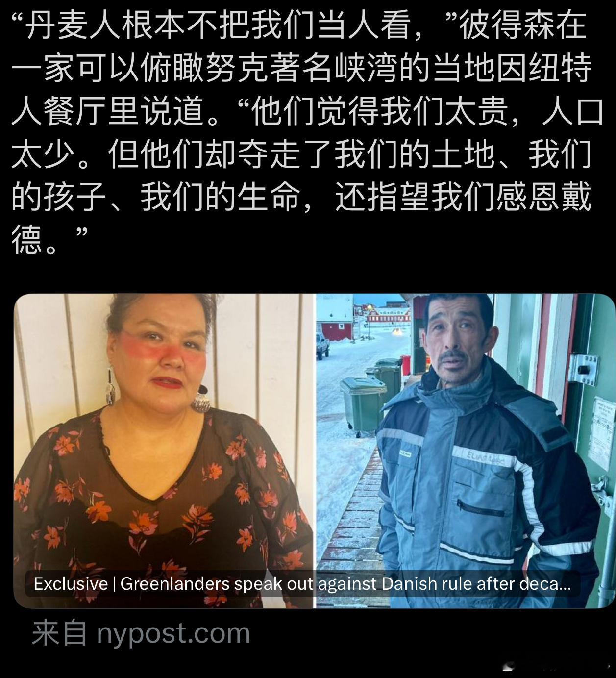 “丹麦人根本不把我们当人看,”彼得森在一家可以俯瞰努克著名峡湾的当地因纽特人餐厅里说道。“他们觉得我们太贵,人口太少。但他们却夺走了我们的土地、我们的孩子、我们的生命,还指望我们感恩戴德。”
