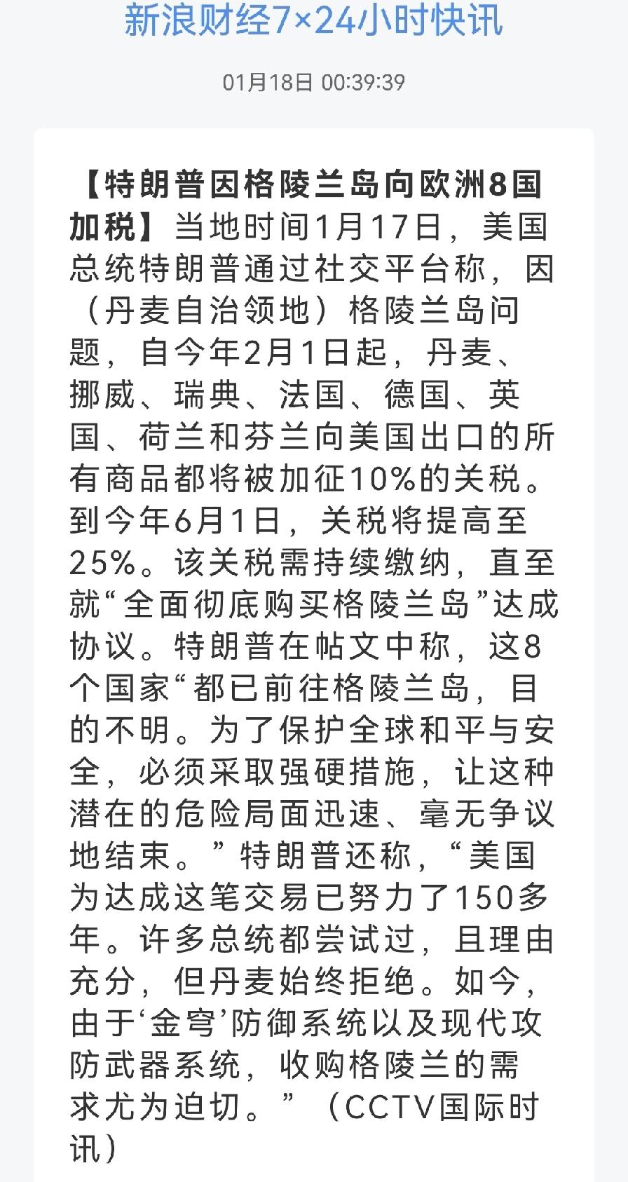 特朗普怒了,对不同意收购格陵兰岛的国家加征灌水 当地时间1月17日,美国总统特朗普通过社交平台称,因(丹麦自治领地)格陵兰岛问题,自今年2月1日起,丹麦、挪威、瑞典、法国、德国、英国、荷兰和芬兰向美国出口的所有商品都将被加征10%的灌水。到今年6月1日,灌水将提高至25%。 该关税需持续缴纳,直至就“全面彻底购买格陵兰岛”达成协议。特朗普在帖文中称,这8个国家“都已前往格陵兰岛,目的不明。为了保护全球和平与安全,必须采取强硬措施,让这种潜在的危险局面迅速、毫无议地结束。” 多嘴:“这8个国家都已前往格陵兰岛,目的不明”,你要说7个还好,丹麦人家就不能去吗?你都提“购买”了,你向空气提出的? 加征灌水也好,也让盟友了解一下,灌水之王不是白来的,而且还是已经被赠予“诺贝尔和平奖”的“灌水之王”。已经不管缘由、不管是非,上来就是“灌水”,而且已经没有“敌友之分”。 委内瑞拉、格陵兰岛 和乌克兰,有什么两样? 欧盟既然已经对大鹅实施了19轮制裁,那么这一次,欧盟也敢于出手吗?还是只会绝望的“在墙角哀嚎”。难怪特朗普都说“欧洲已经堕落了”,确实也没有什么“脊梁”。 我觉得,欧盟不妨“将一军”,就像某国145% Vs 145% 一样,TACO,Trump Always Checked Out,管保川普投降,最起码他还是需要小弟的~~ (图片源自网络侵权告知删除)