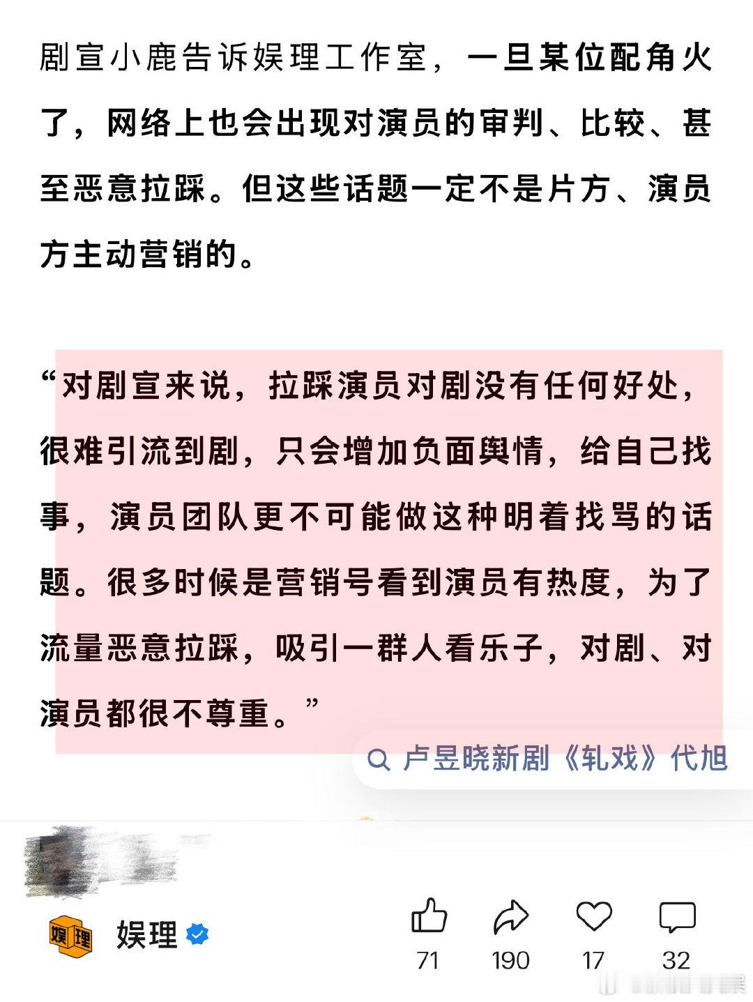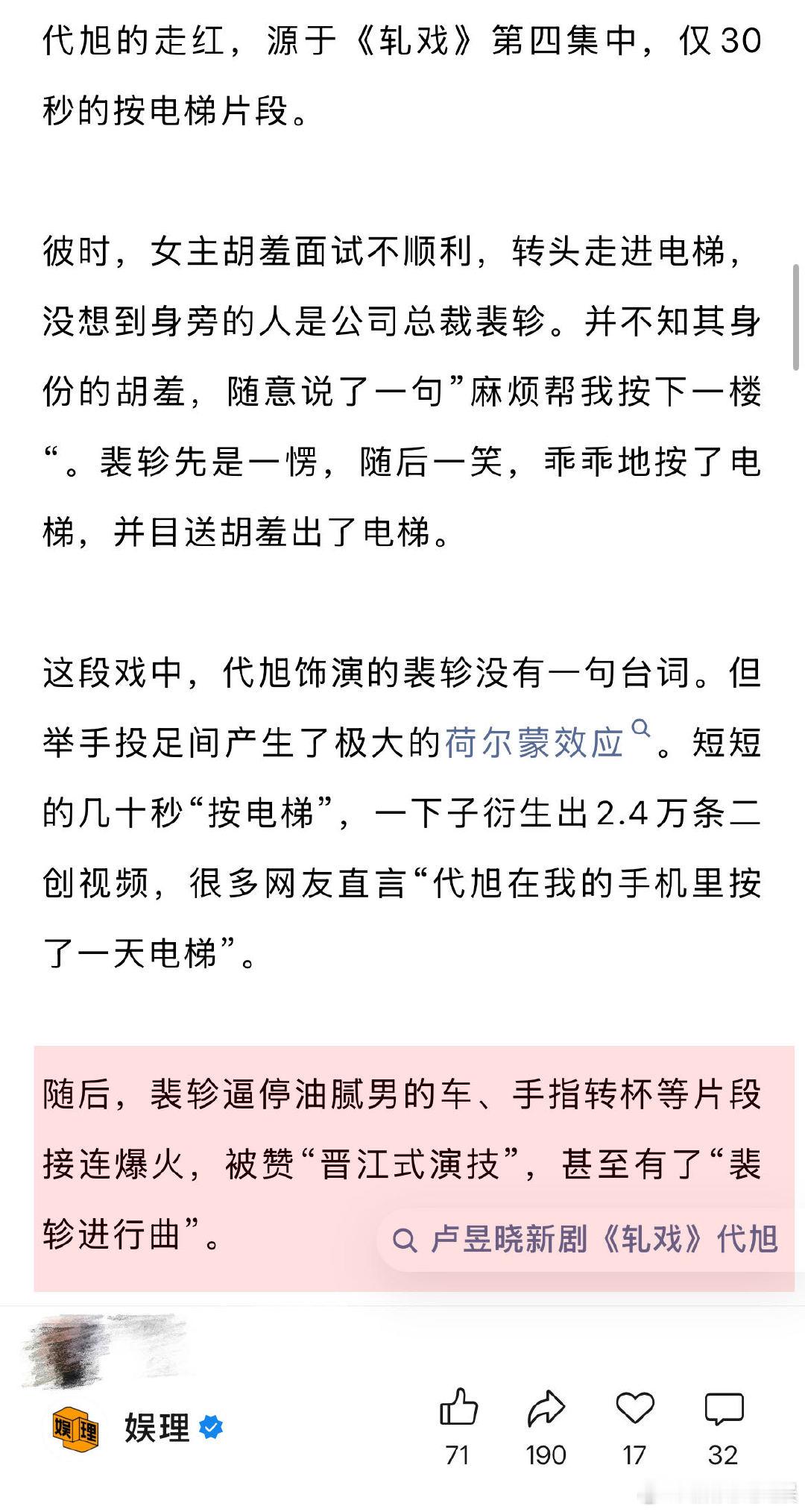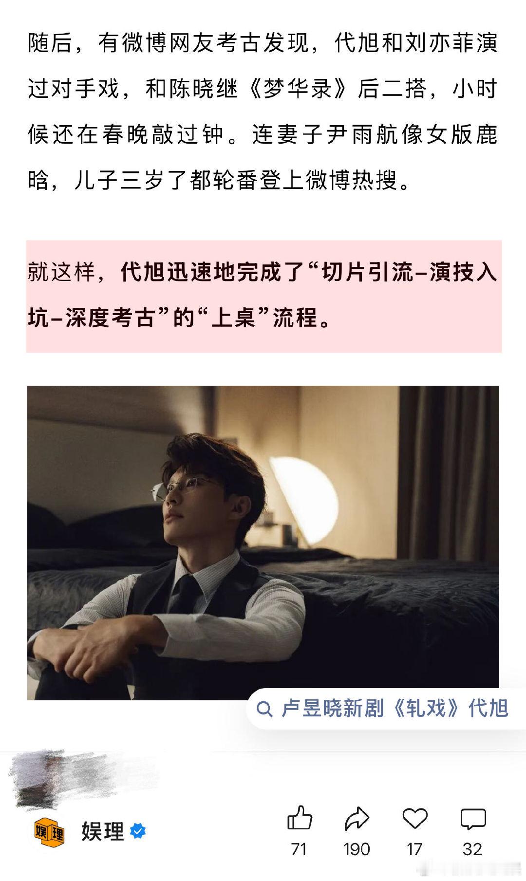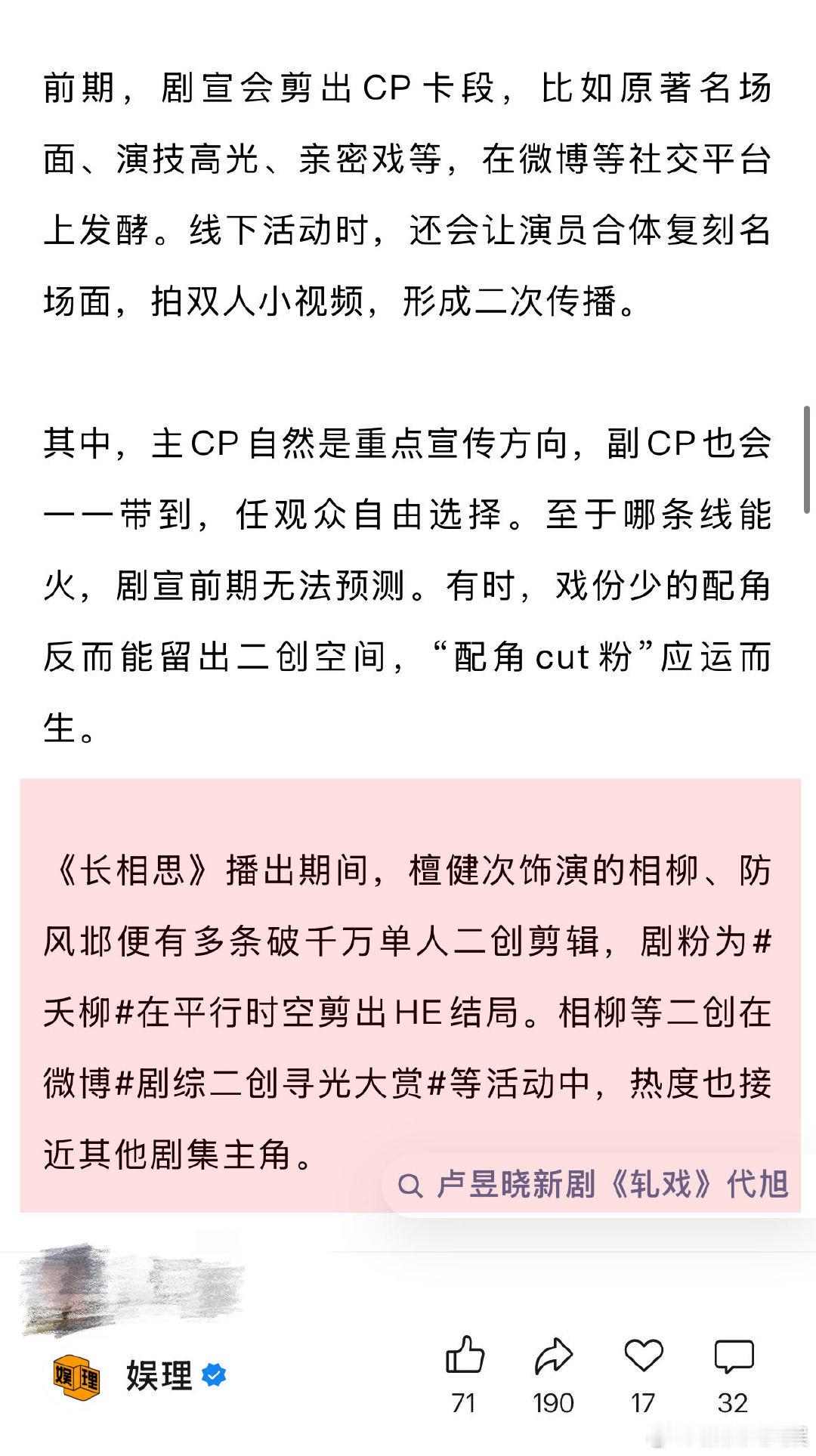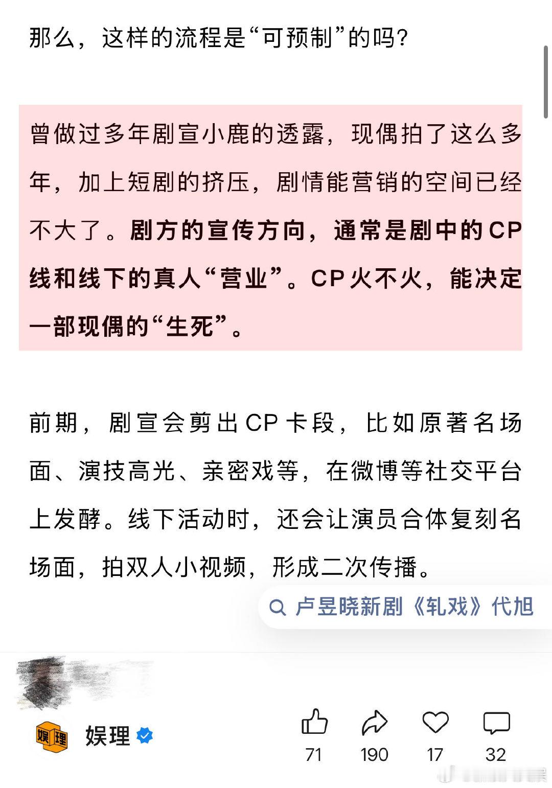 业内谈代旭走红上桌 编剧称很多男配人设比男主讨喜 代旭凭借《轧戏》走红上桌的流程是“可预制”的吗?某剧宣透露,现偶拍了这么多年,加上短剧的挤压,能营销的空间已经不大了。宣传方向通常是剧中的CP线和线下的真人“营业”CP火不火能决定剧集的生死。有时戏份少的配角反而能留出二创空间,“配角cut粉”应运而生…娱理独家↓