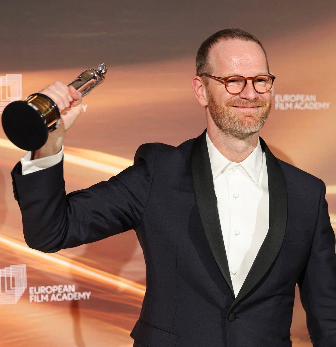 《情感价值》剧组成员们在欧洲电影奖上与奖杯的合照