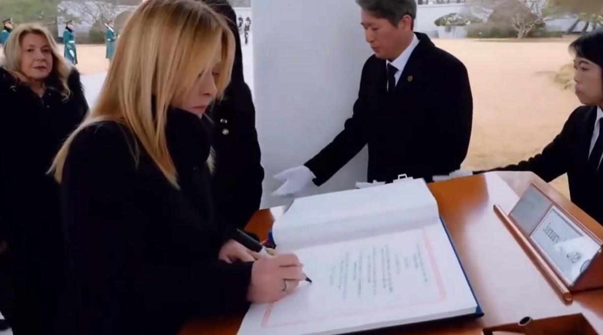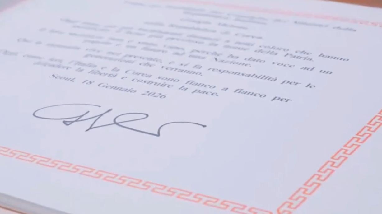 1月18日梅洛尼向韩国公墓敬献花圈后,在留言簿上签名,字迹曝光字如其人;只见她签名时,摄影师把镜头对准了留言簿,总理女士在上面写上自己的名字,简简单单的字母看起来十分潇洒。 让人没想到的是她的字真的像本人一样很大气,名字组成的字母不多,写名字时用的时间很短,但刚劲有力,而且下笔的时候很自信。 签完名后,工作人员还拿来一个册子,上面应该是介绍公墓的,还当着总理女士的面儿翻开看并讲解,最后工作人员把这本册子送给了意大利总理。