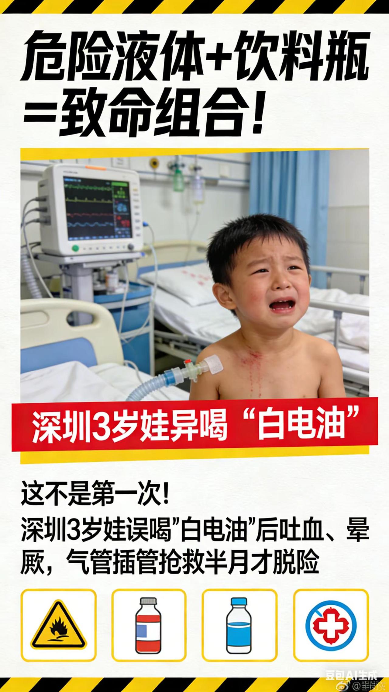 千万警惕!这个“致命错误”很多家庭还在犯。一瓶看似普通的“矿泉水”,差点让7岁男孩再也醒不来。1月16日,河南7岁的轩轩感冒了,爷爷顺手用桌上“矿泉水”给他冲药。孩子喝下后察觉味道不对,爷爷一尝才发现——瓶里装的竟是火锅燃料油!孩子迅速出现呕吐、意识模糊,连夜转院抢救。如今仍在ICU,肝肾功能受损,面临透析,尚未脱离危险。爷爷自责到无法进食入睡。**这不是个例!**深圳也曾有3岁孩子误喝瓶中“白电油”,当场晕厥、吐血,气管插管抢救半个月才脱险。**⚠️ 血的教训:**多少人习惯把清洁剂、机油、不明液体随手倒进饮料瓶?总觉得“自己记得住”。但家里有老人、孩子,他们可能会好奇,可能会拿错。一瓶“遗忘”的致命液体,足以瞬间摧毁一个家庭。**✅ 立刻检查你家:**1️⃣ 任何非食用液体,绝不用食品饮料瓶分装!2️⃣ 强腐蚀性、有毒物品必须明确标识,放在孩子绝对拿不到的高处或锁起来。3️⃣ 告诉家中老人和孩子:不明液体,绝不入口!一次侥幸,可能是一生无法挽回的痛。转发提醒身边人,别让饮料瓶成为“隐形杀手”!家庭安全 儿童防护 危险物品存放 别再乱用饮料瓶